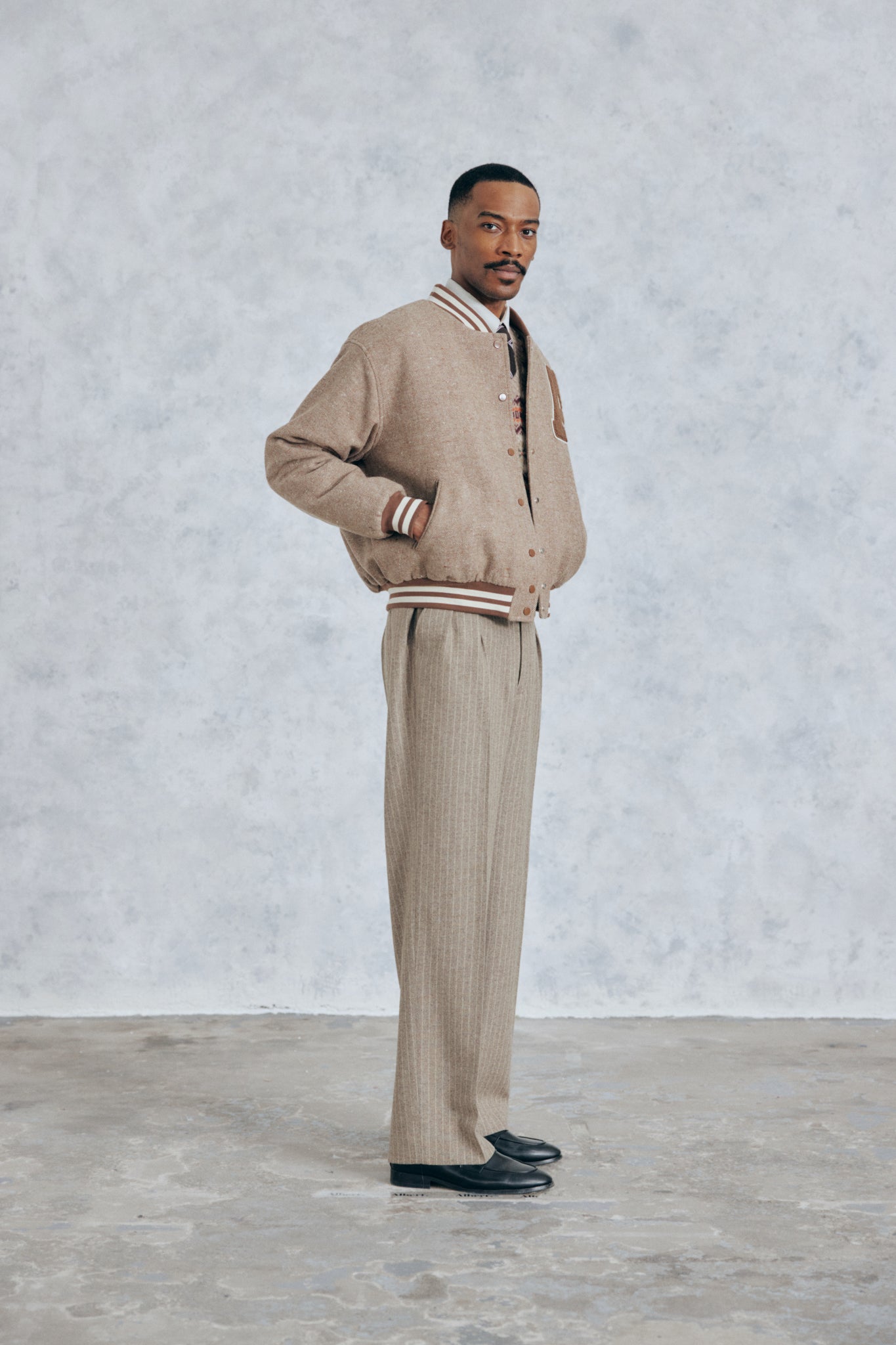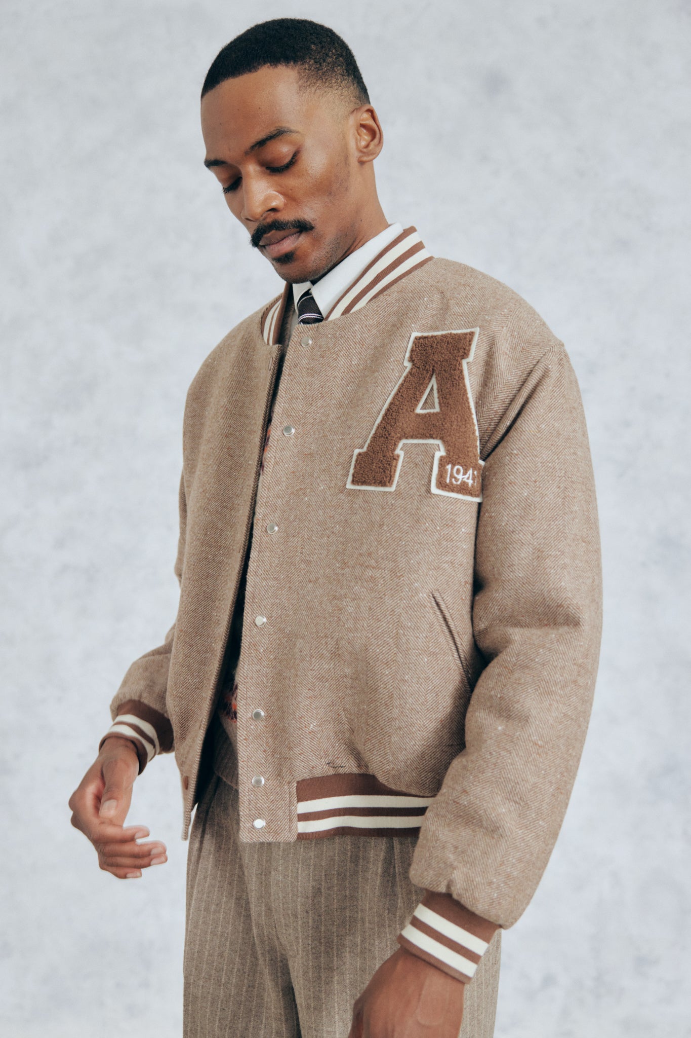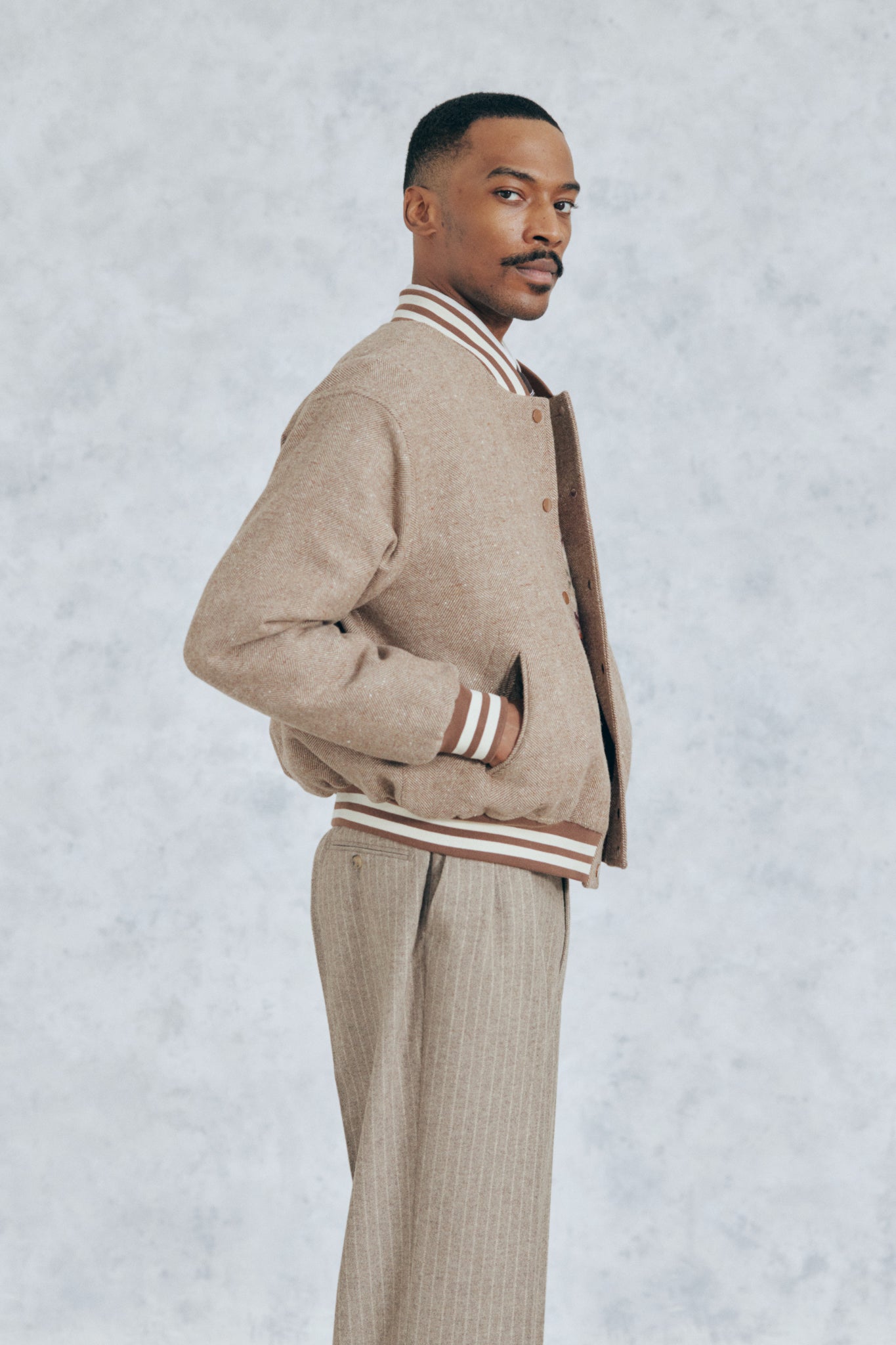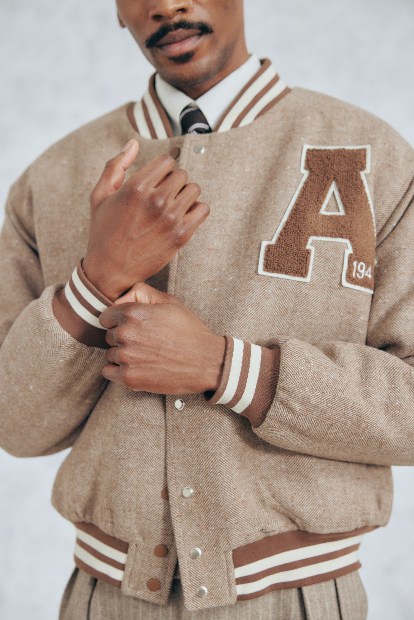 The Albert Varsity Jacket in full oatmeal herringbone wool reinterprets classic collegiate style with a refined, textural elegance. Crafted entirely from premium wool in a subtle herringbone weave, it offers warmth, depth, and a soft yet structured handle, bringing a sophisticated character to a timeless silhouette.