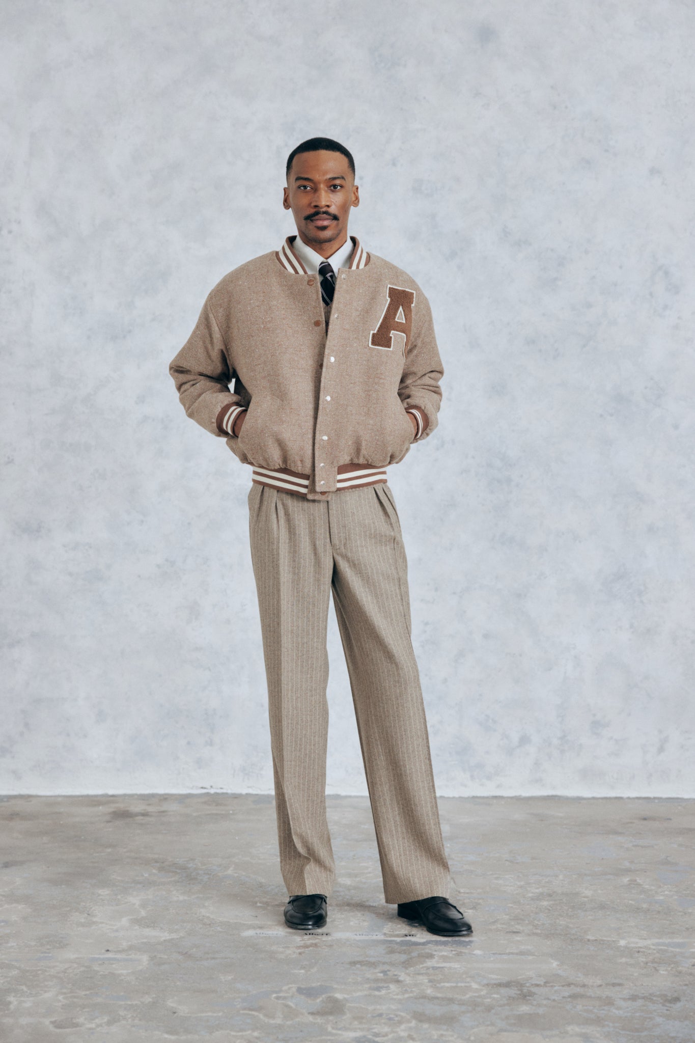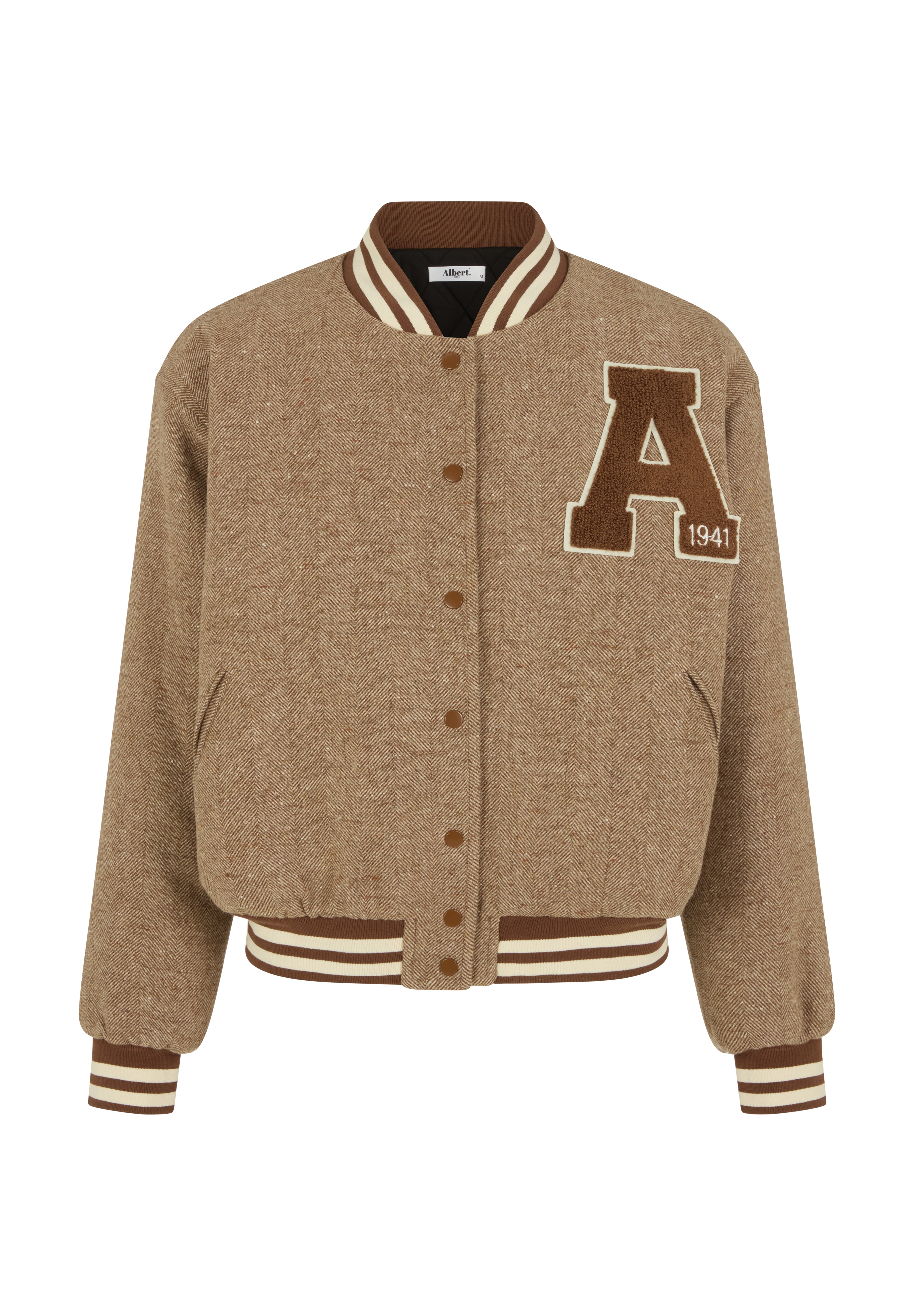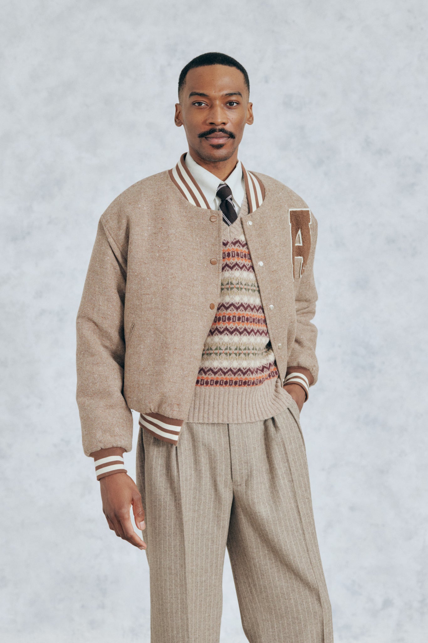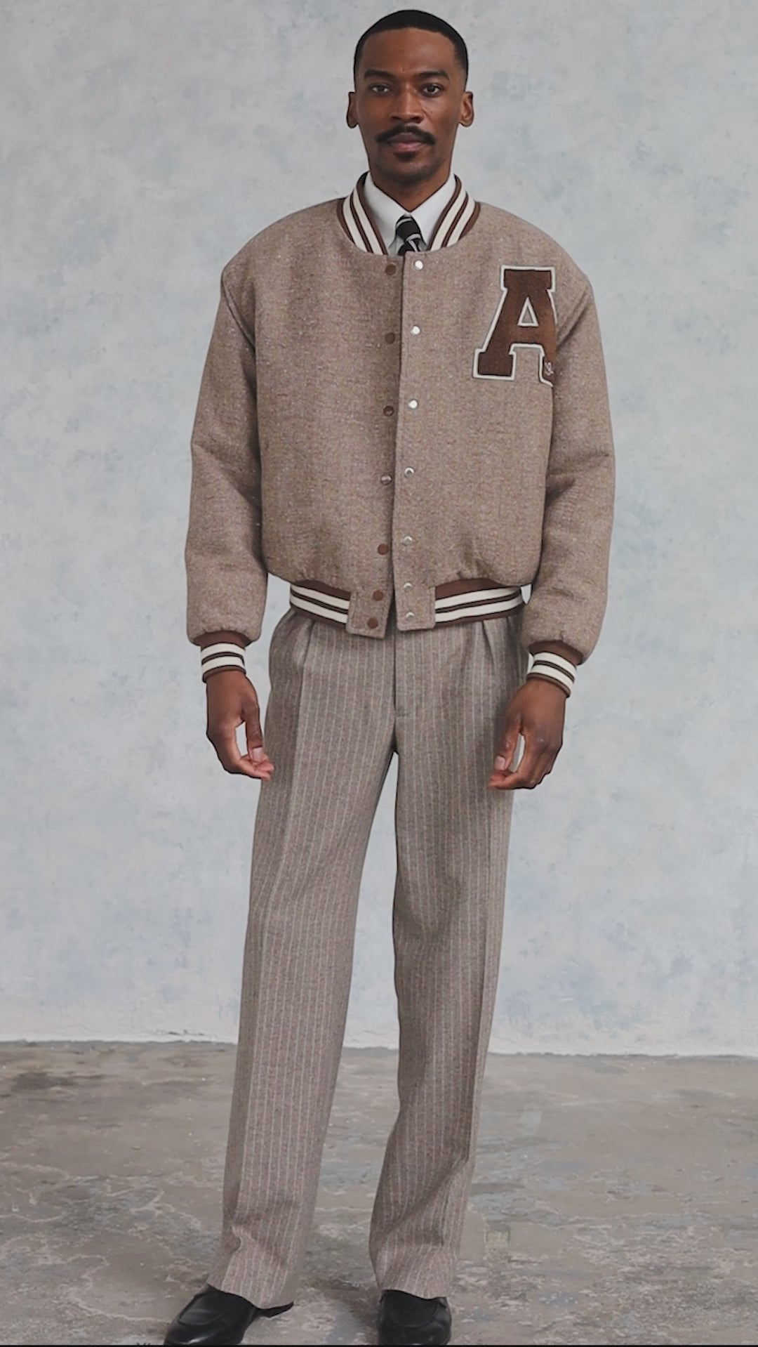 The Albert Varsity Jacket in full oatmeal herringbone wool reinterprets classic collegiate style with a refined, textural elegance. Crafted entirely from premium wool in a subtle herringbone weave, it offers warmth, depth, and a soft yet structured handle, bringing a sophisticated character to a timeless silhouette.