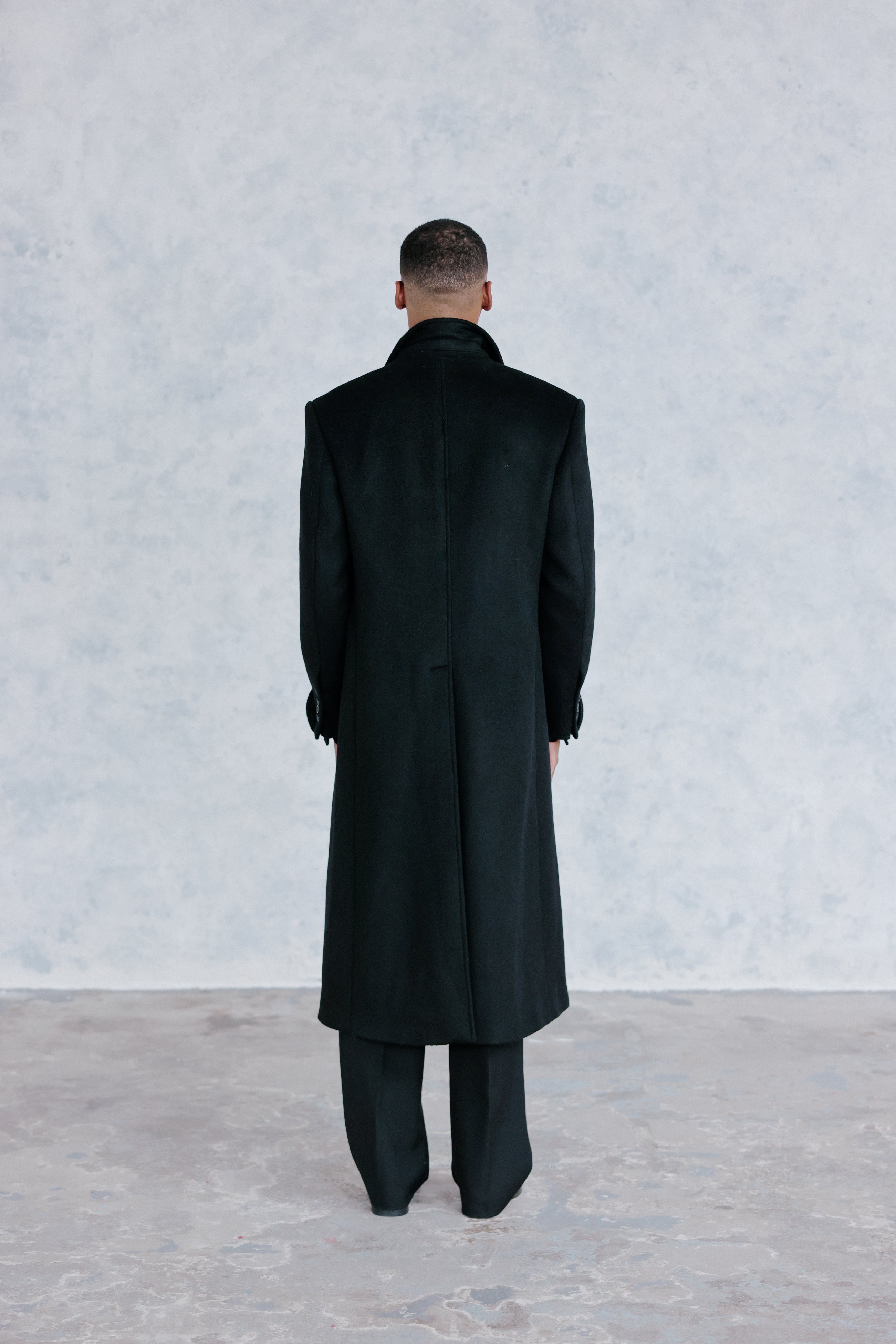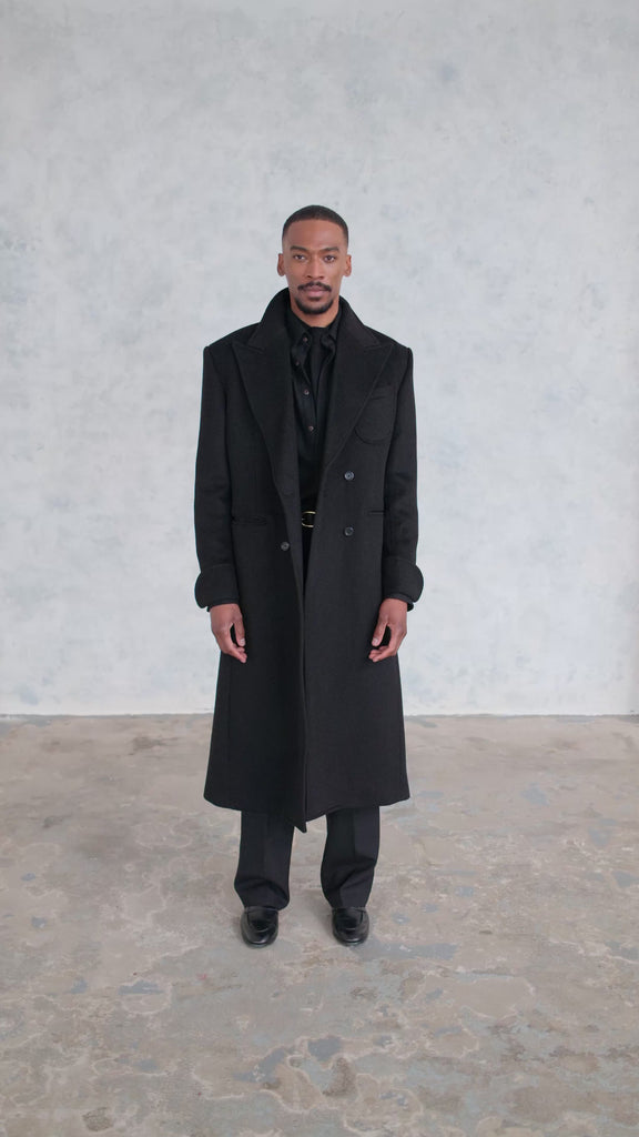 The Black Alpina Overcoat is a study in modern elegance, crafted from a luxurious blend of Mongolian wool and cashmere. Its deep black hue enhances the richness of the fabric, offering a sleek and versatile outer layer that moves effortlessly between formal and casual settings. The exceptional softness of the cloth creates a refined tactile experience while providing natural warmth for the colder months.