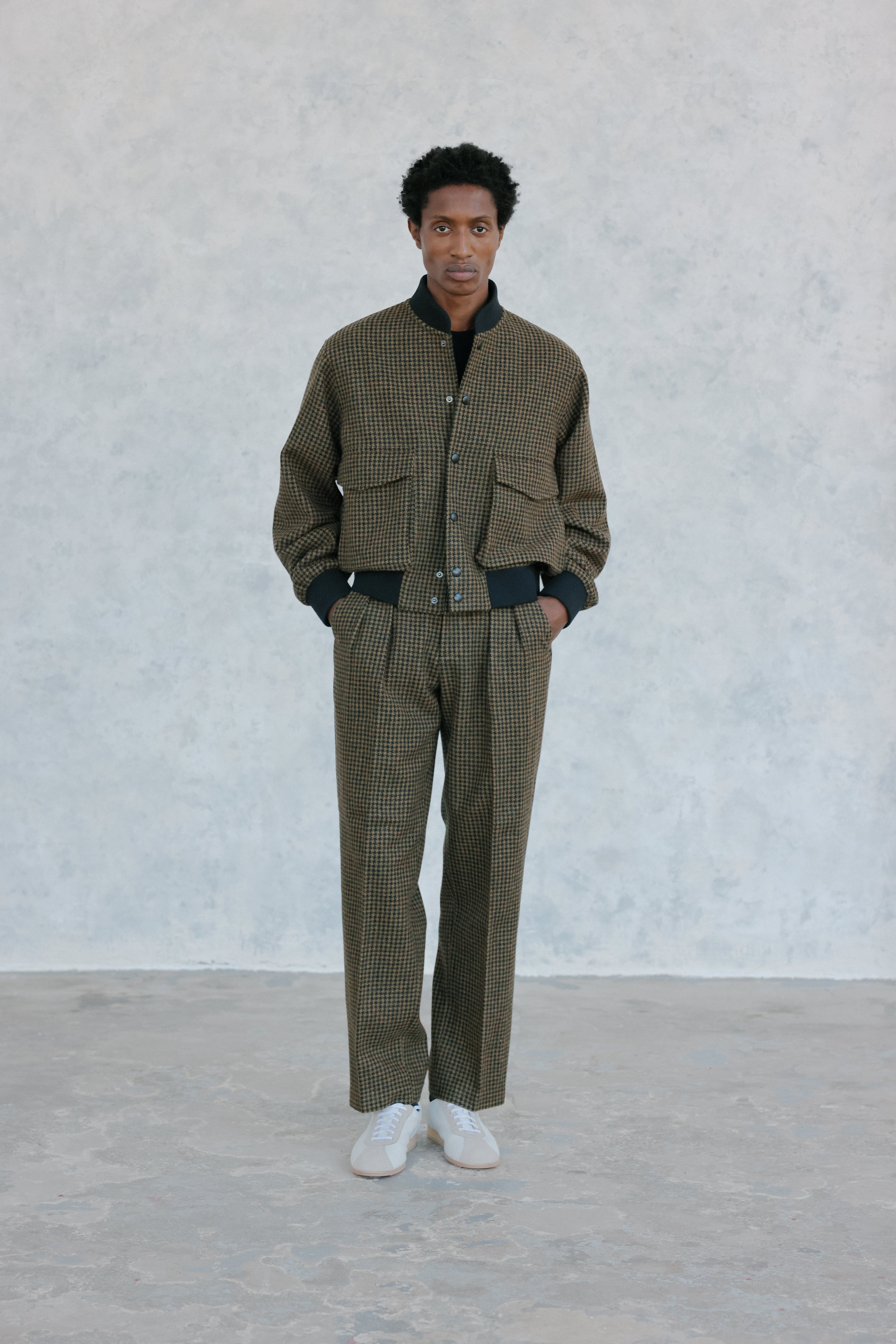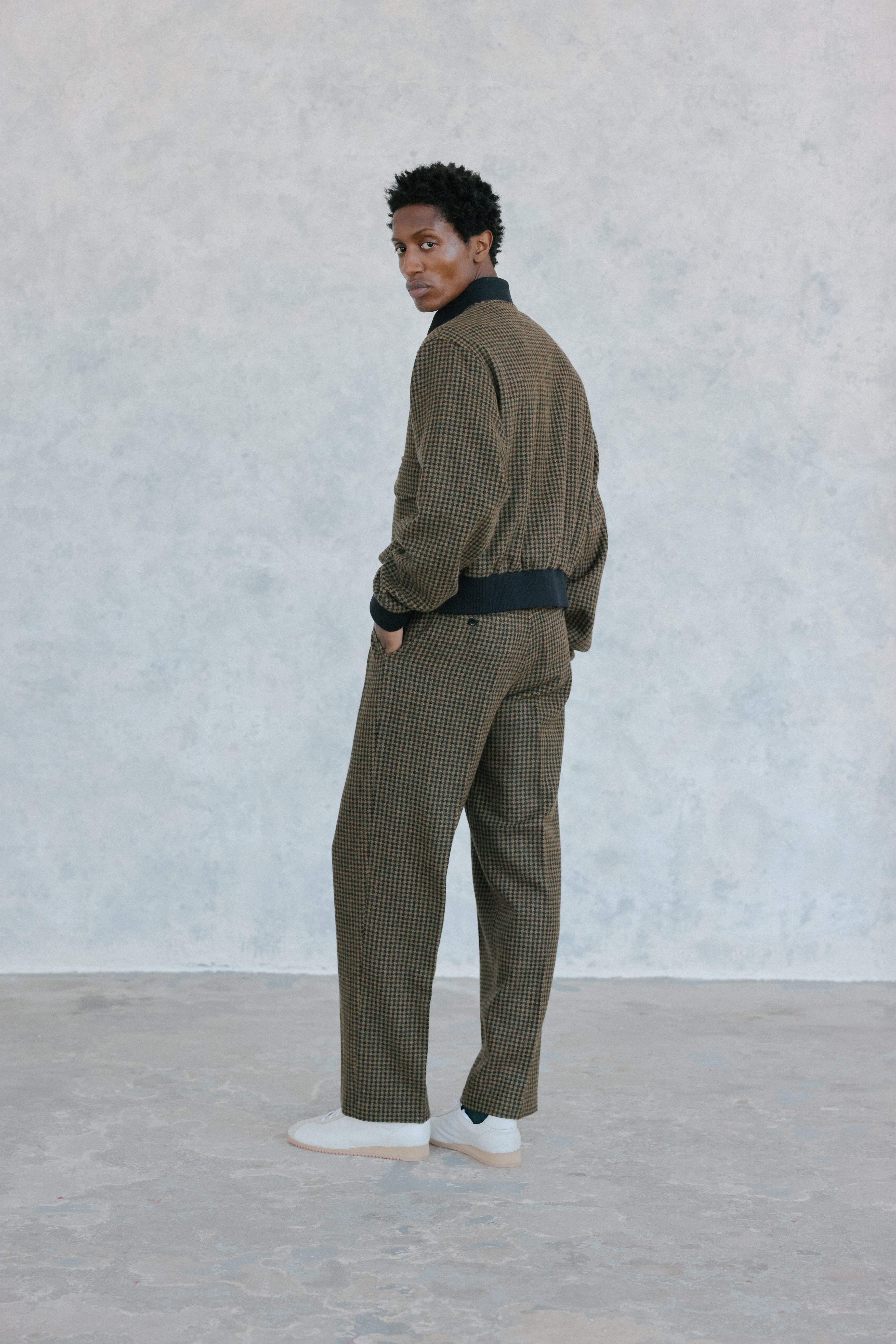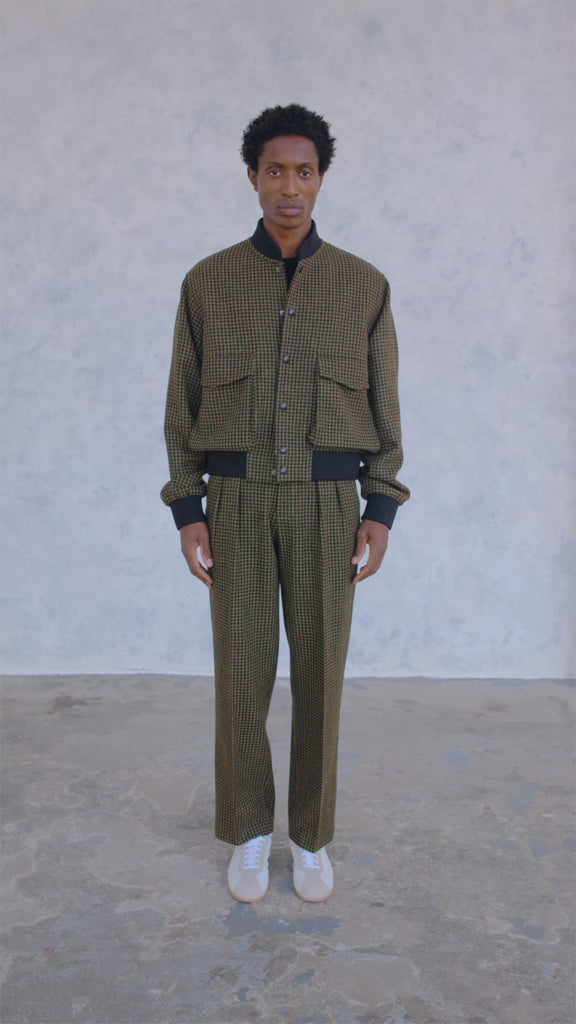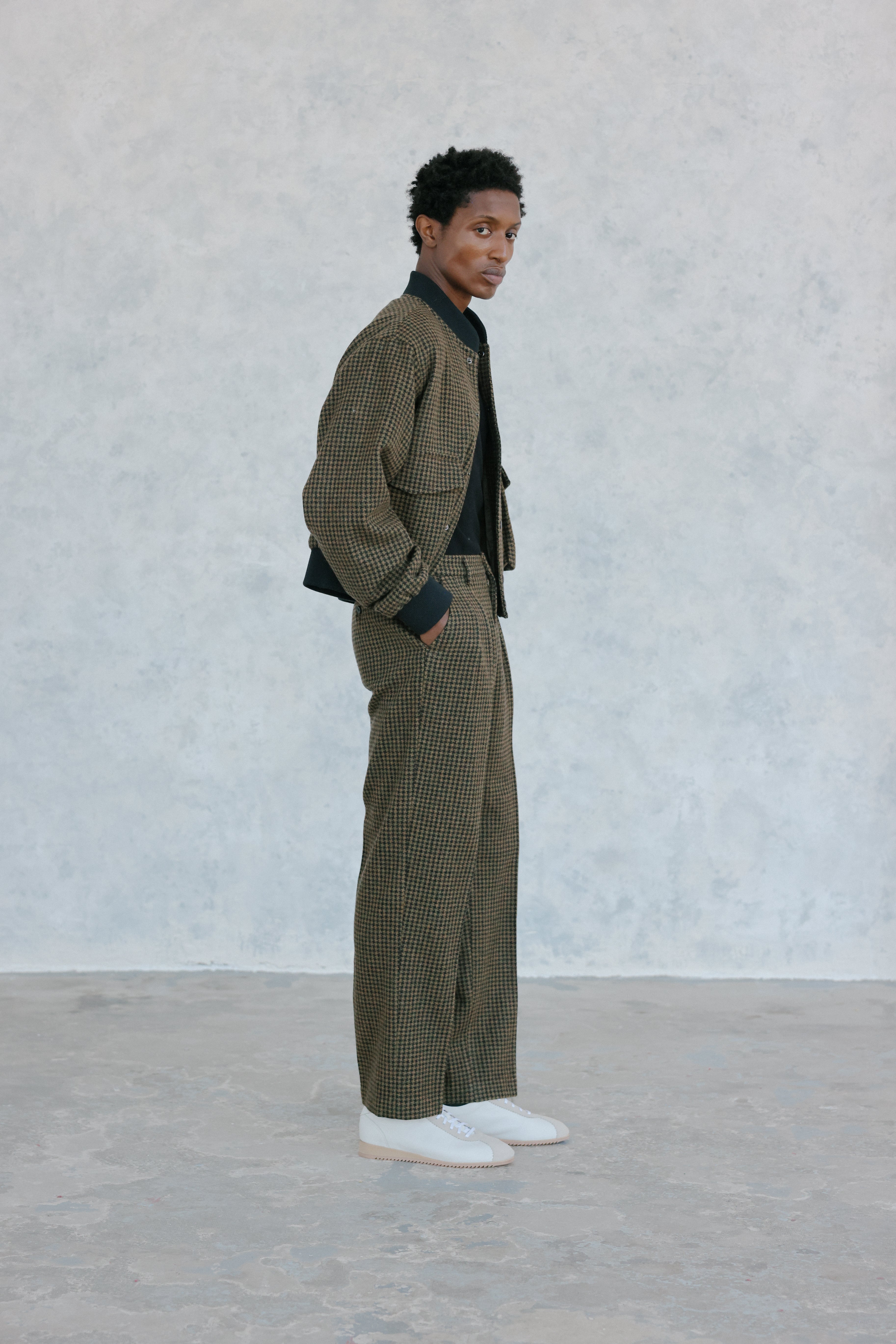 Crafted from a green and black houndstooth wool cloth, the Anderson Pants balance structure and comfort, offering a polished yet relaxed appearance. The textured pattern adds depth and distinction, giving the trousers a bold, contemporary character rooted in classic tailoring.