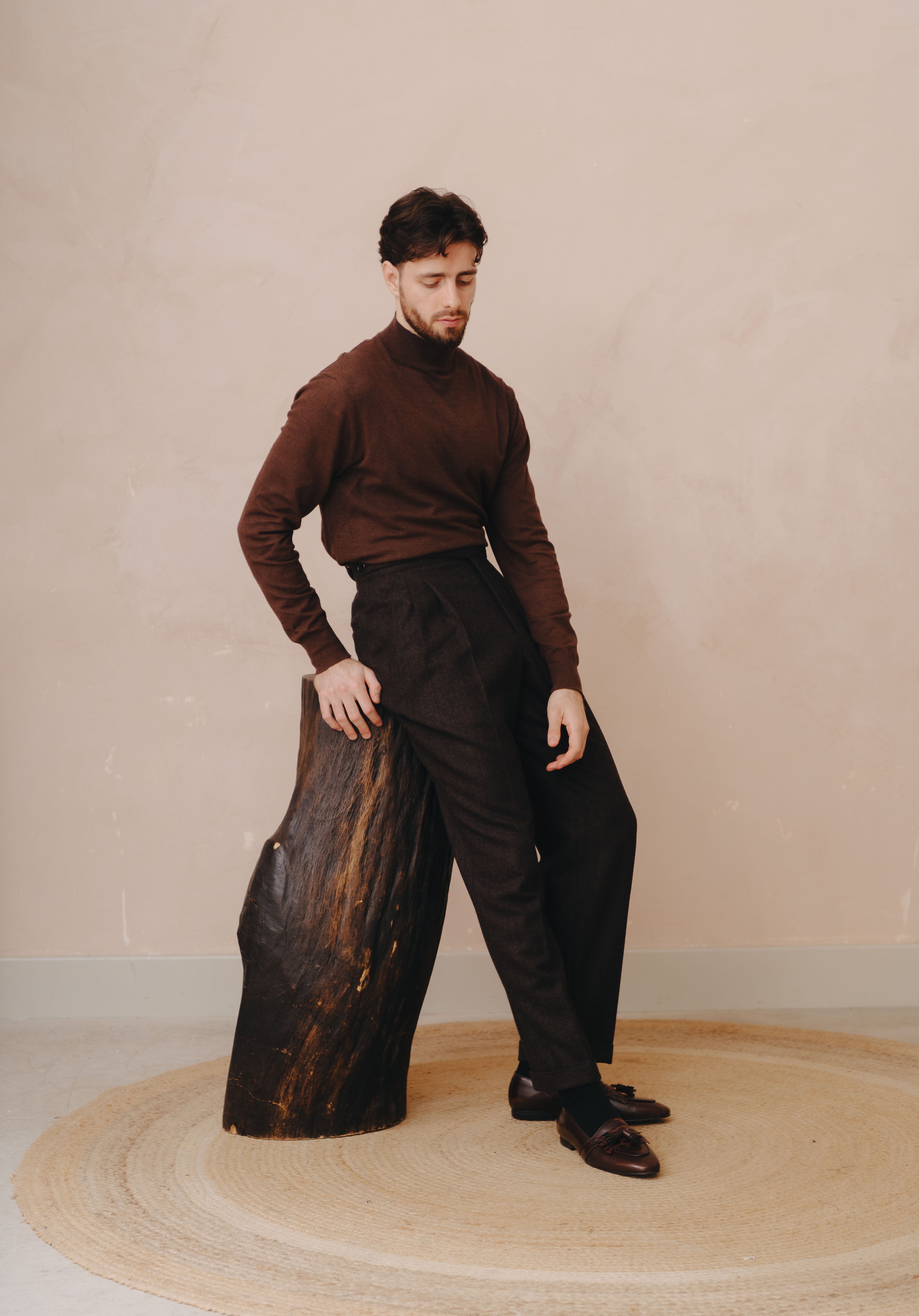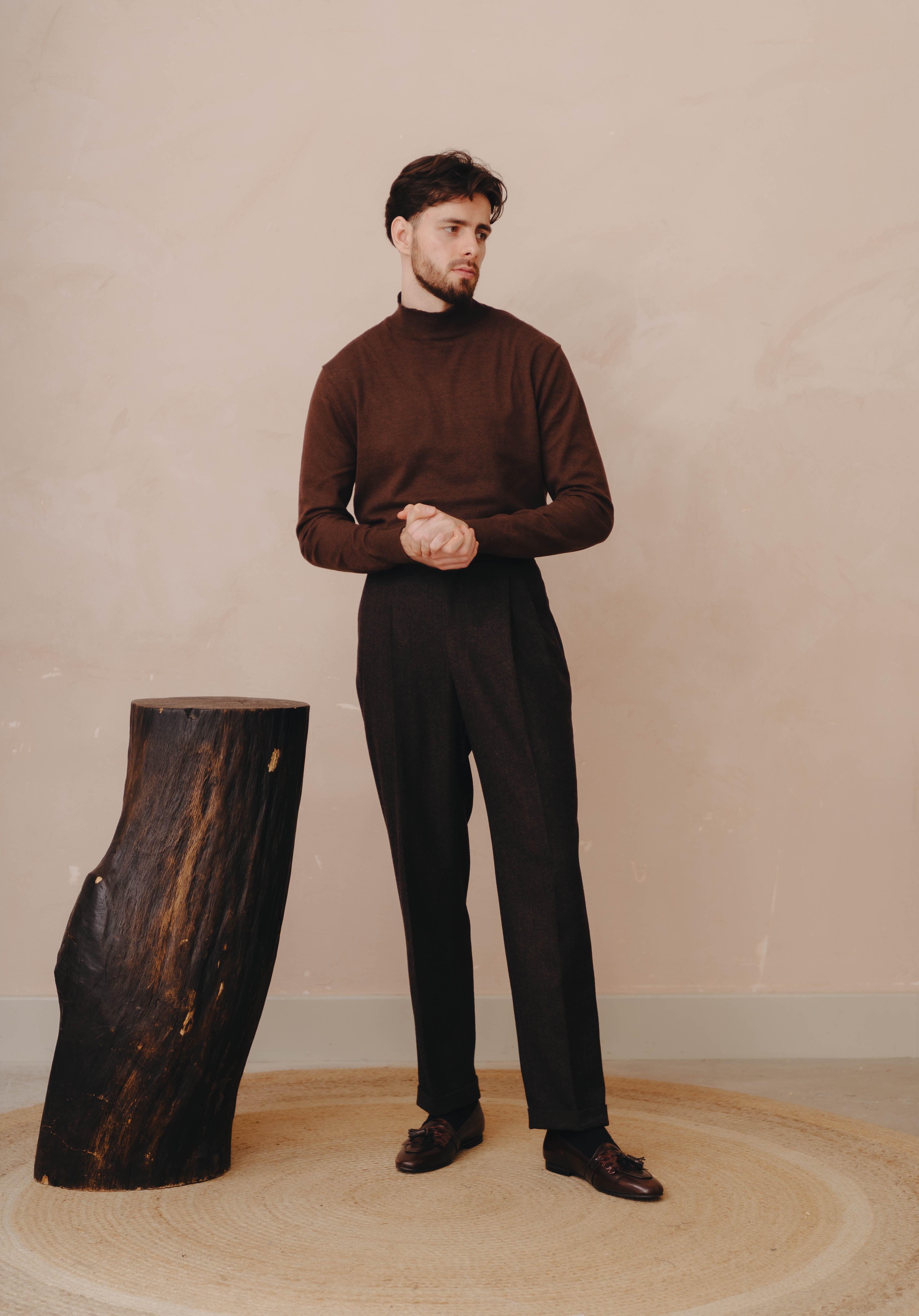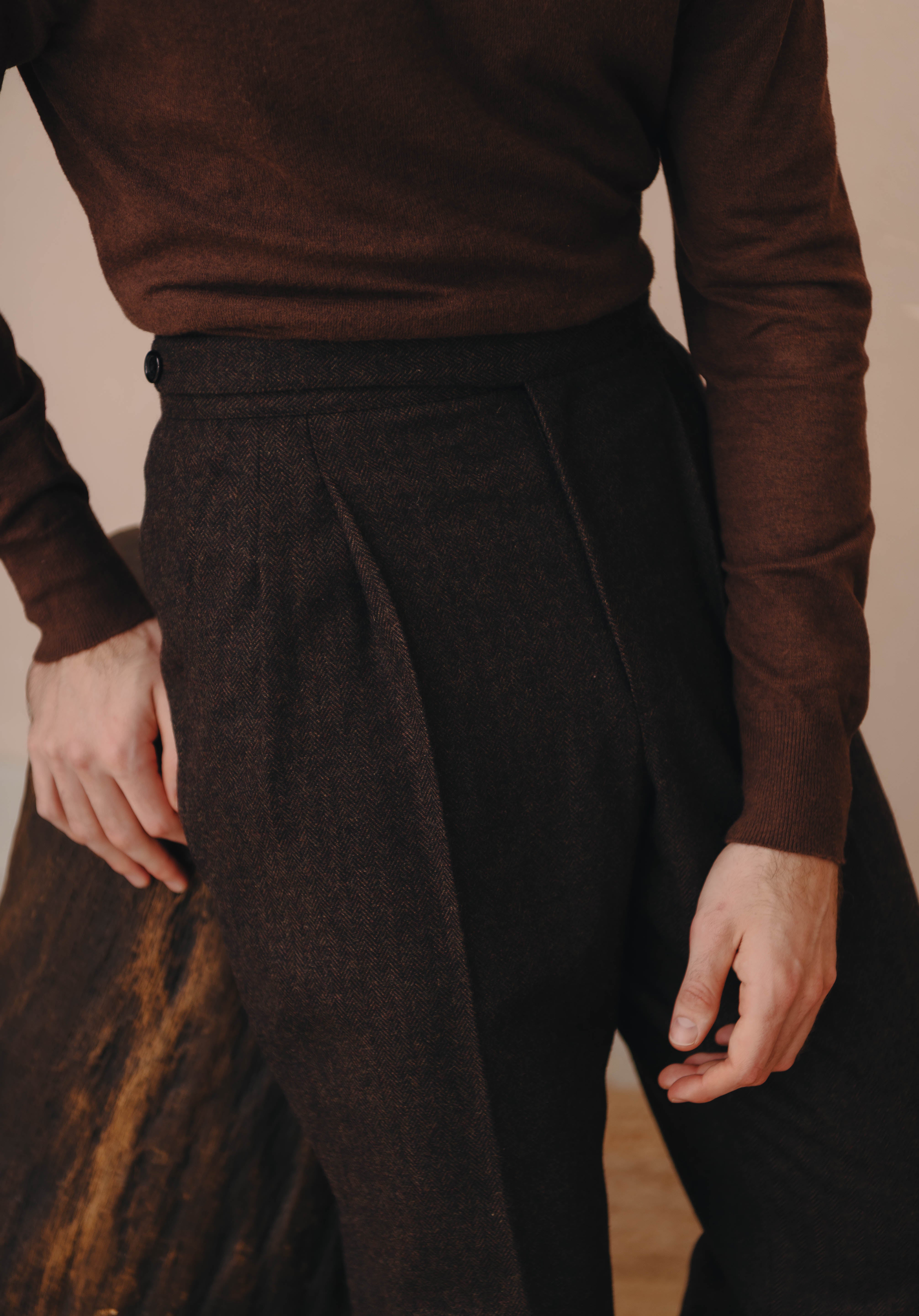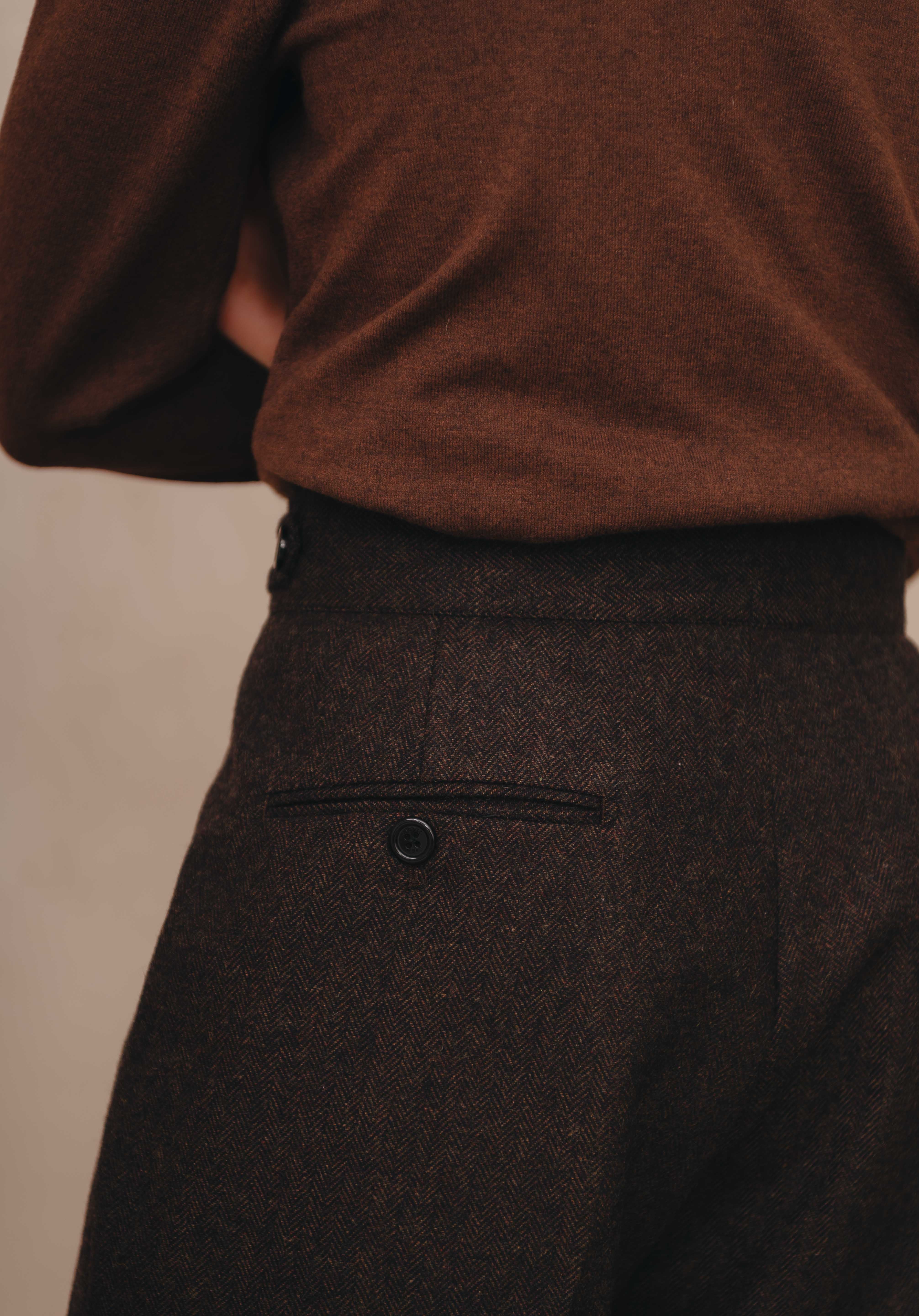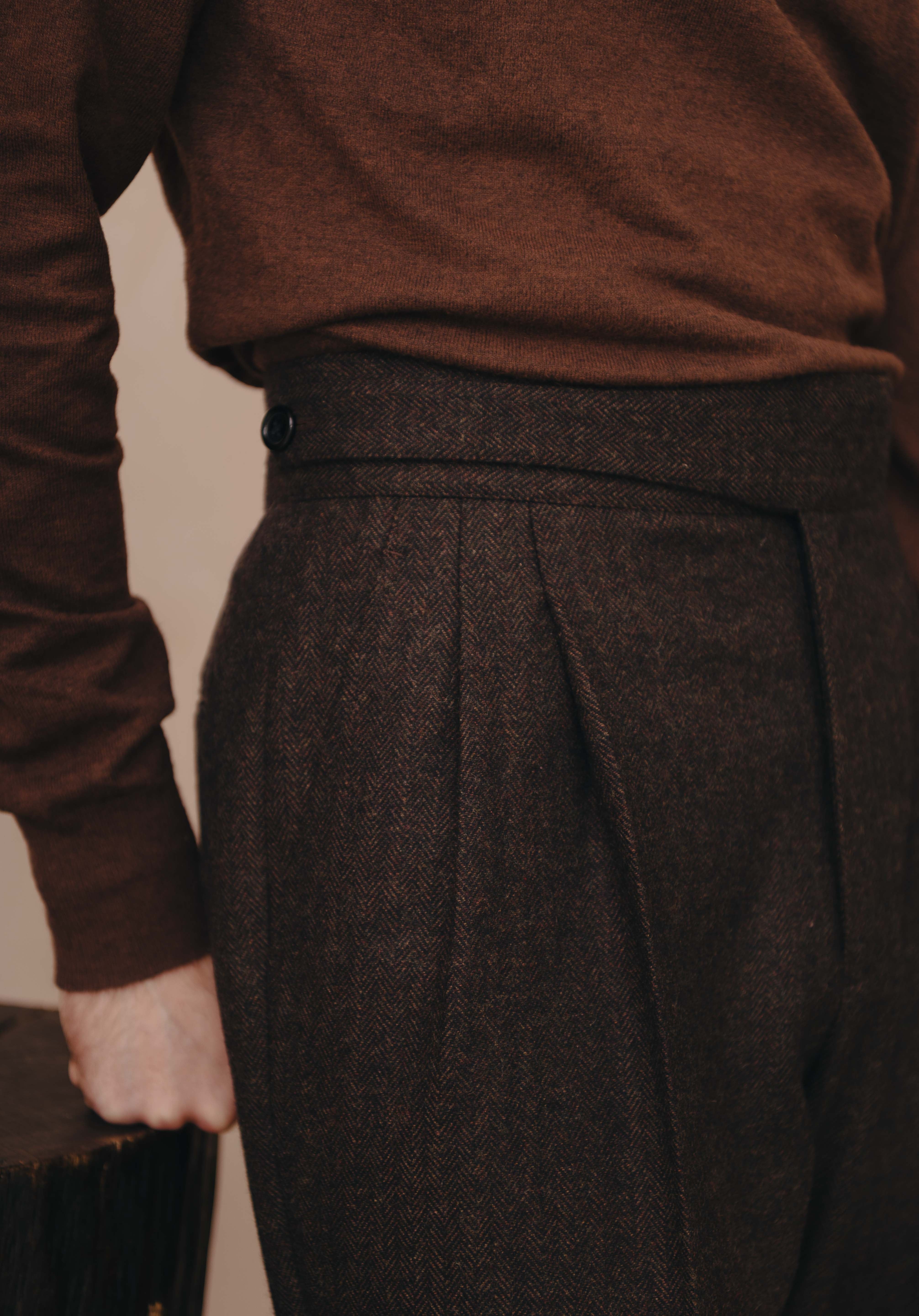Our Belfast Gurkha Pants are an essential for any fashion forward mans wardrobe. Made from a brown herringbone tweed cloth these pants give you the best of both worlds of street style & sartorial. Can be dressed up with a well tailored blazer & shirt or dressed down with a turtleneck/sweater, perfect for cooler temperatures.