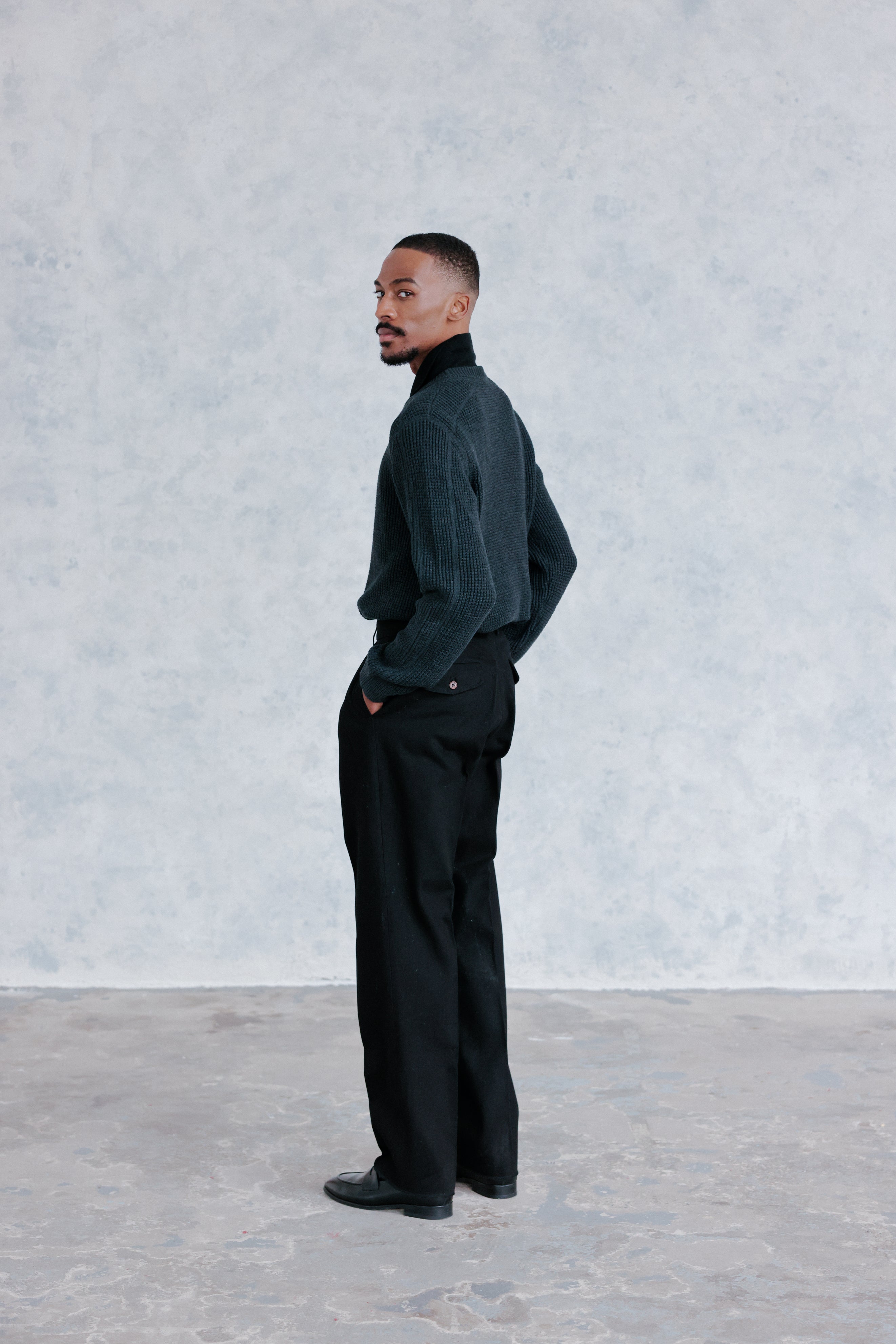 Crafted in a rich charcoal wool and cotton blend, this crew neck delivers the perfect balance of warmth, breathability, and all day comfort. The raglan sleeves echo the easy movement and athletic lines of mid century training gear, while the refined knit and clean silhouette bring it firmly into the present.