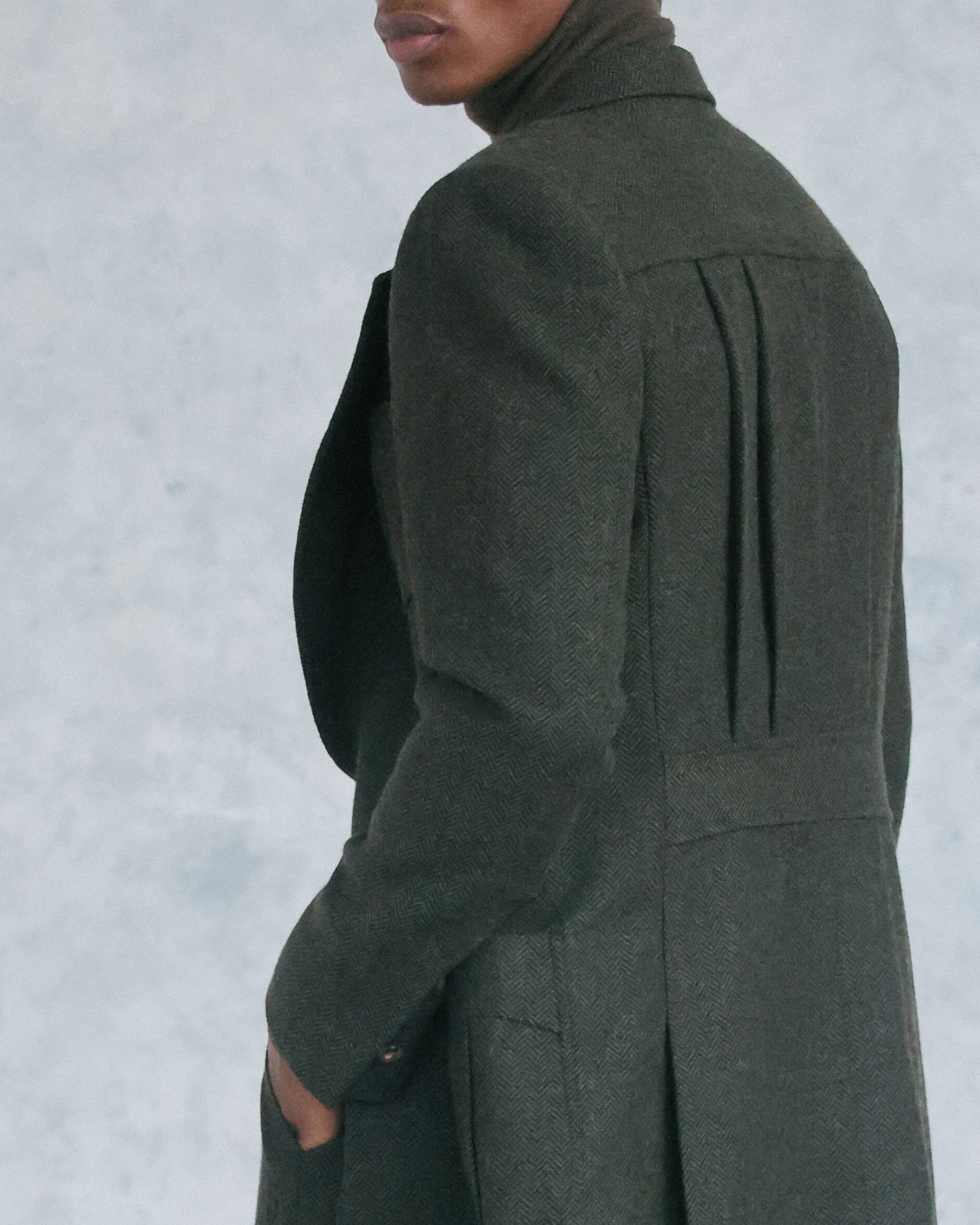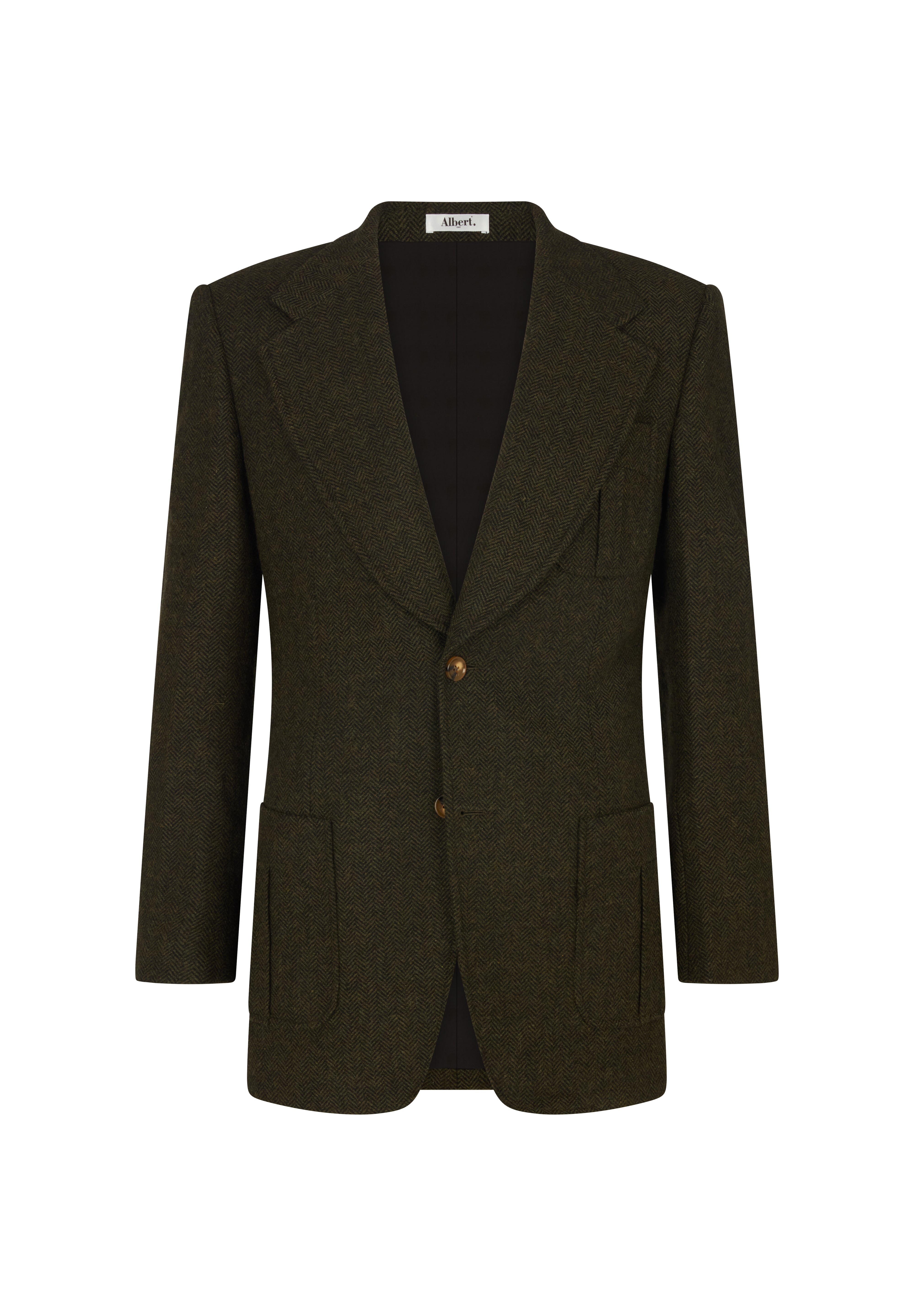 The Kent Blazer is a statement in modern heritage tailoring where timeless craftsmanship meets contemporary edge. Expertly cut from a luxurious heavyweight olive drab Irish tweed herringbone, it offers rich texture and warmth ideal for cooler days. Inspired by the bold refinement of 1970s tailoring, it features a contoured silhouette, wide notch lapels, and an elegant pleated back detail that moves with ease and character. Styled with our matching Kent Pants, the look is effortlessly cohesive and undeniably striking, an expression of refined individuality with a distinctly modern attitude.