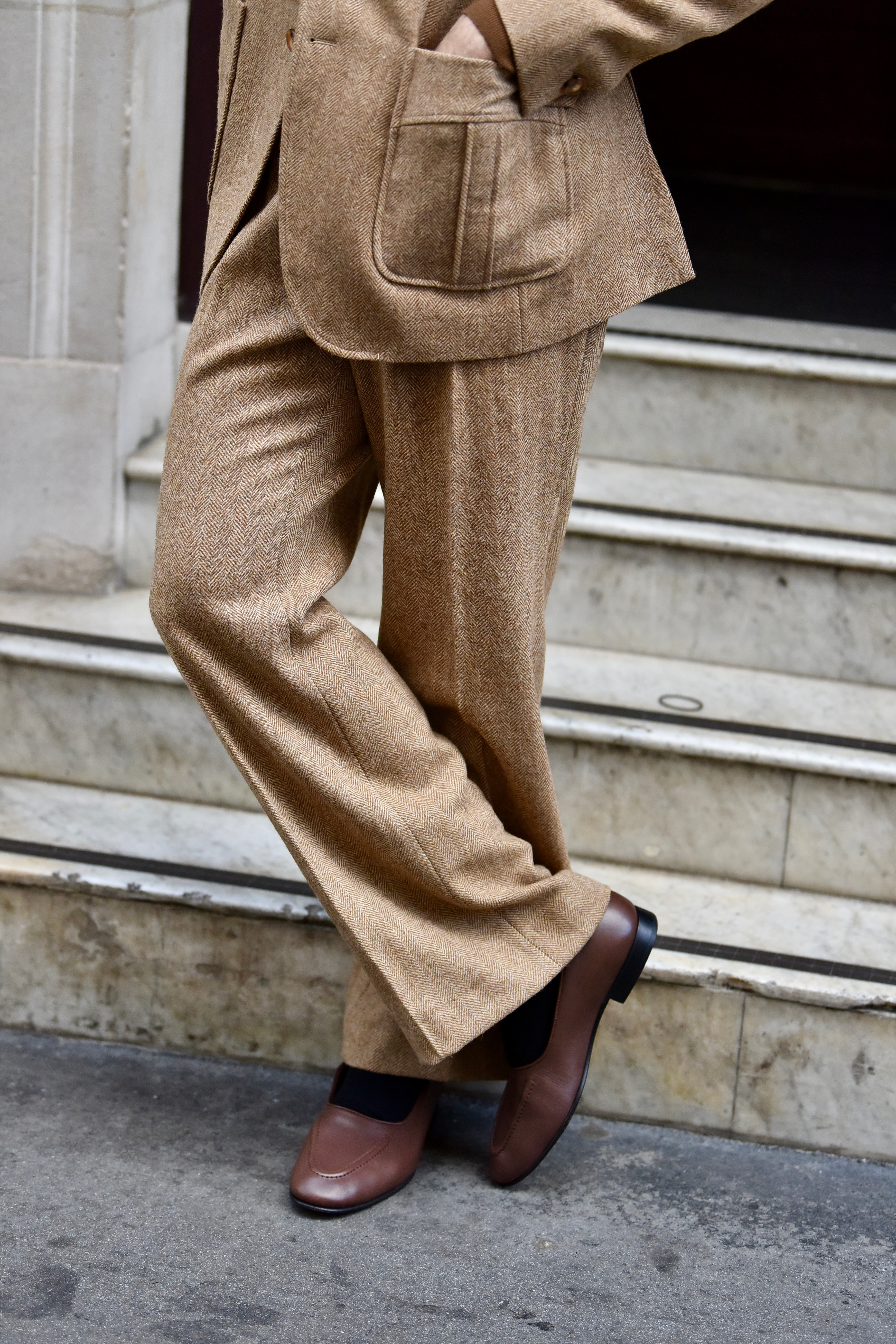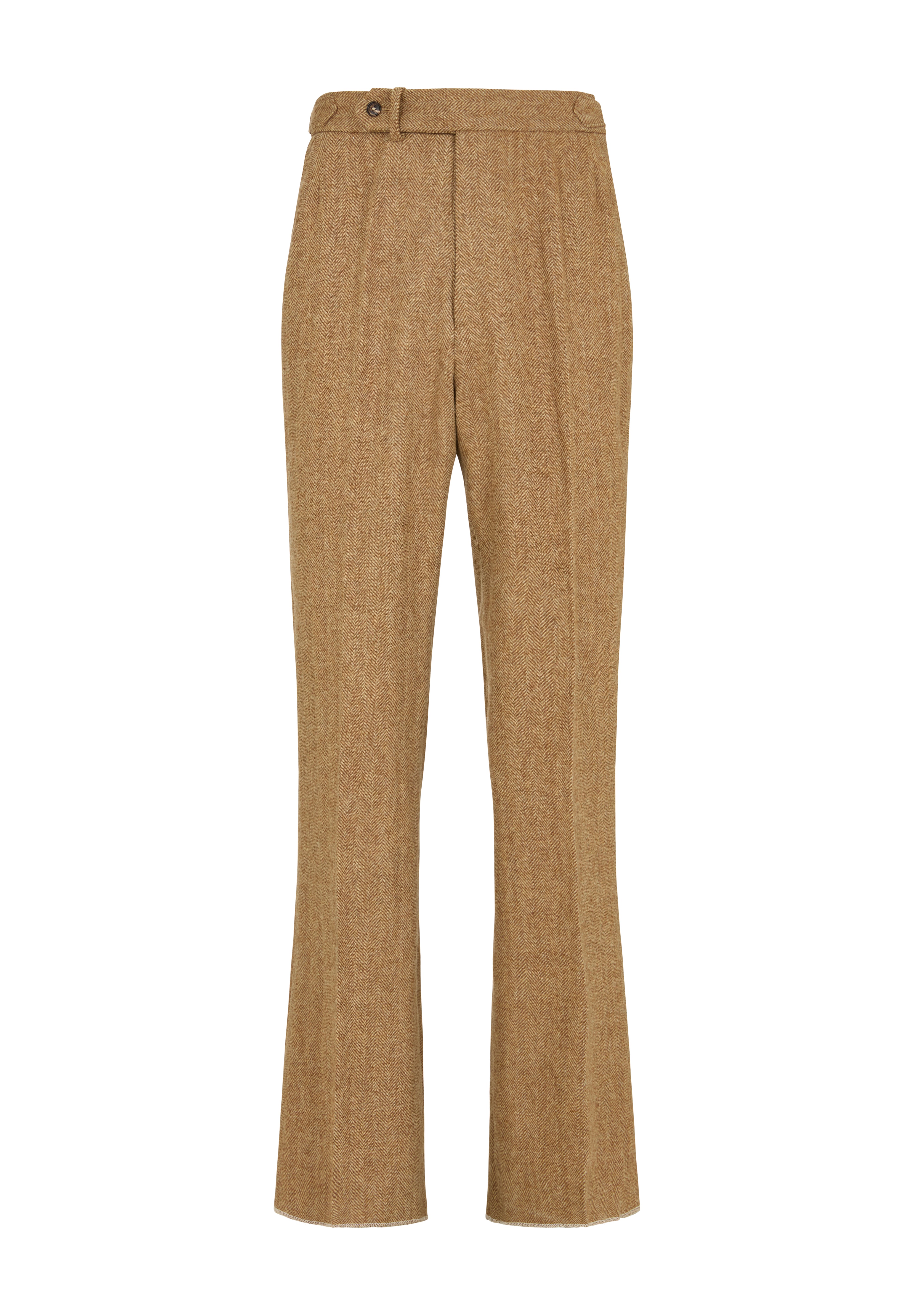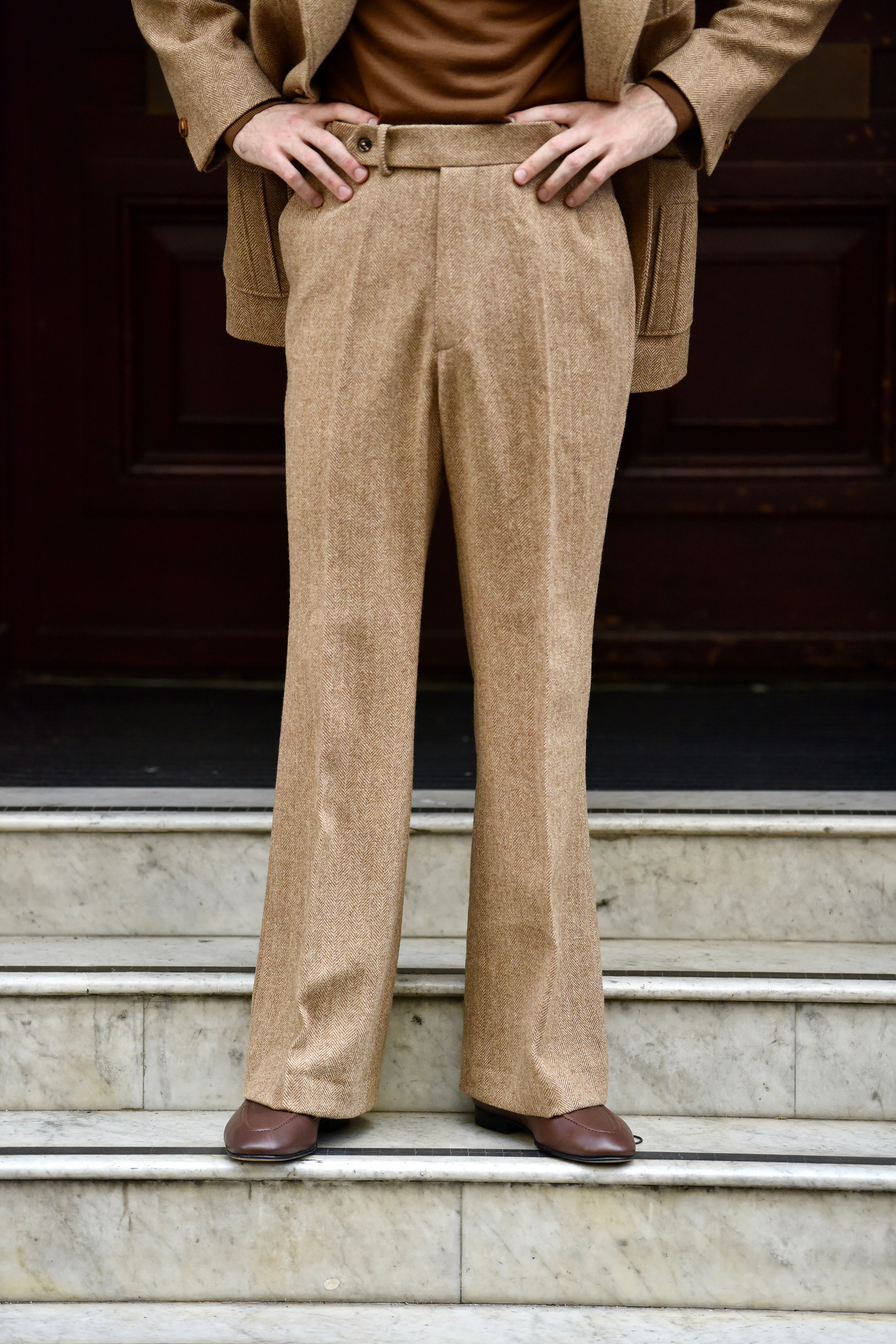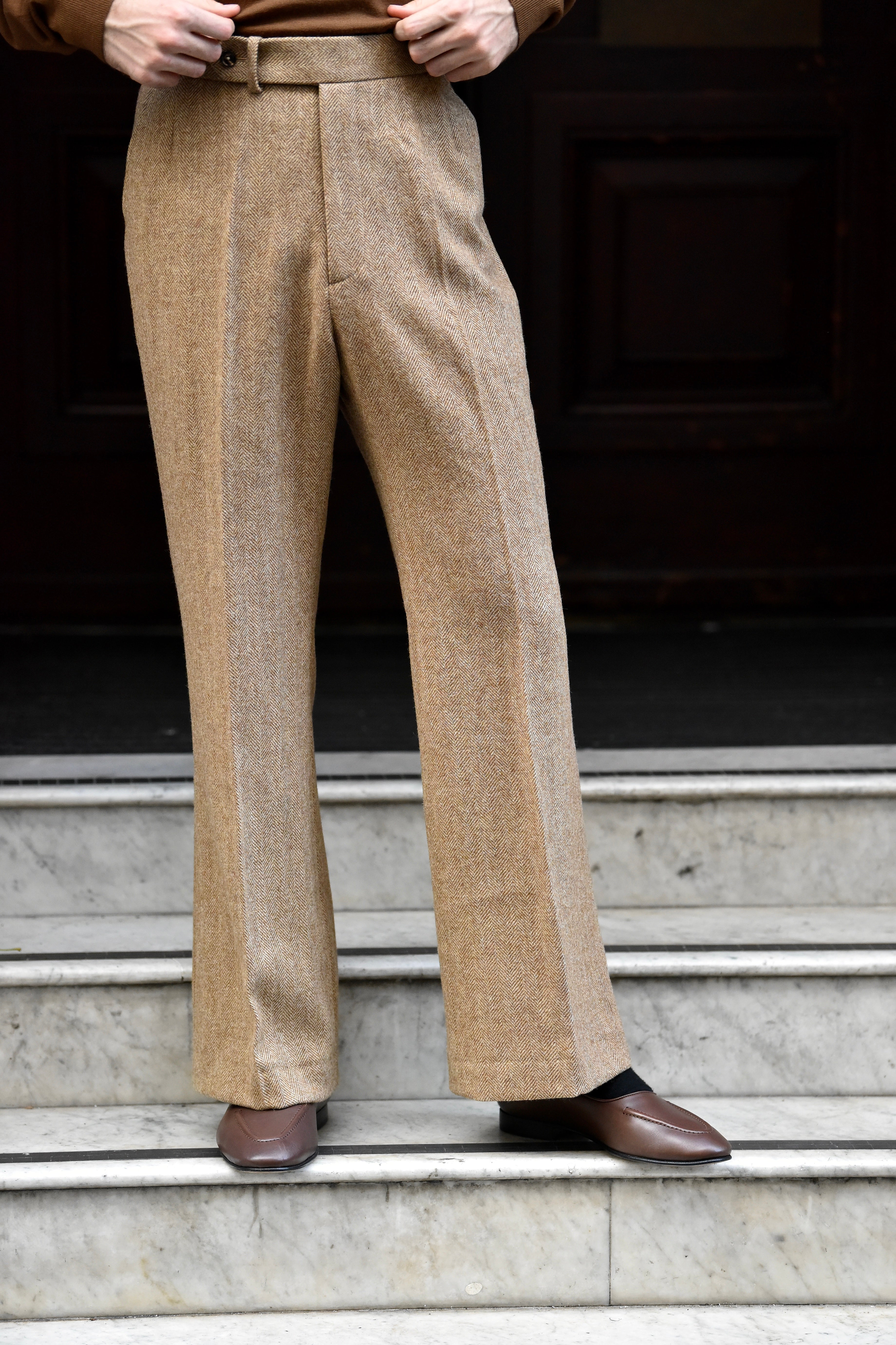 Introducing the Kent Pants—a refined blend of retro inspiration and modern tailoring. Crafted from luxurious camel herringbone wool, these pants pay homage to classic '70s style with an updated silhouette. Designed with a slight flare, they elongate the leg and create a flattering, sophisticated profile. The soft, textured fabric adds warmth and depth, while the tailored cut sits comfortably at the waist, providing structure and a polished fit. Perfect for elevating your seasonal wardrobe, the Kent Pants offer timeless elegance that pairs effortlessly with everything from chunky knits to sleek blazers