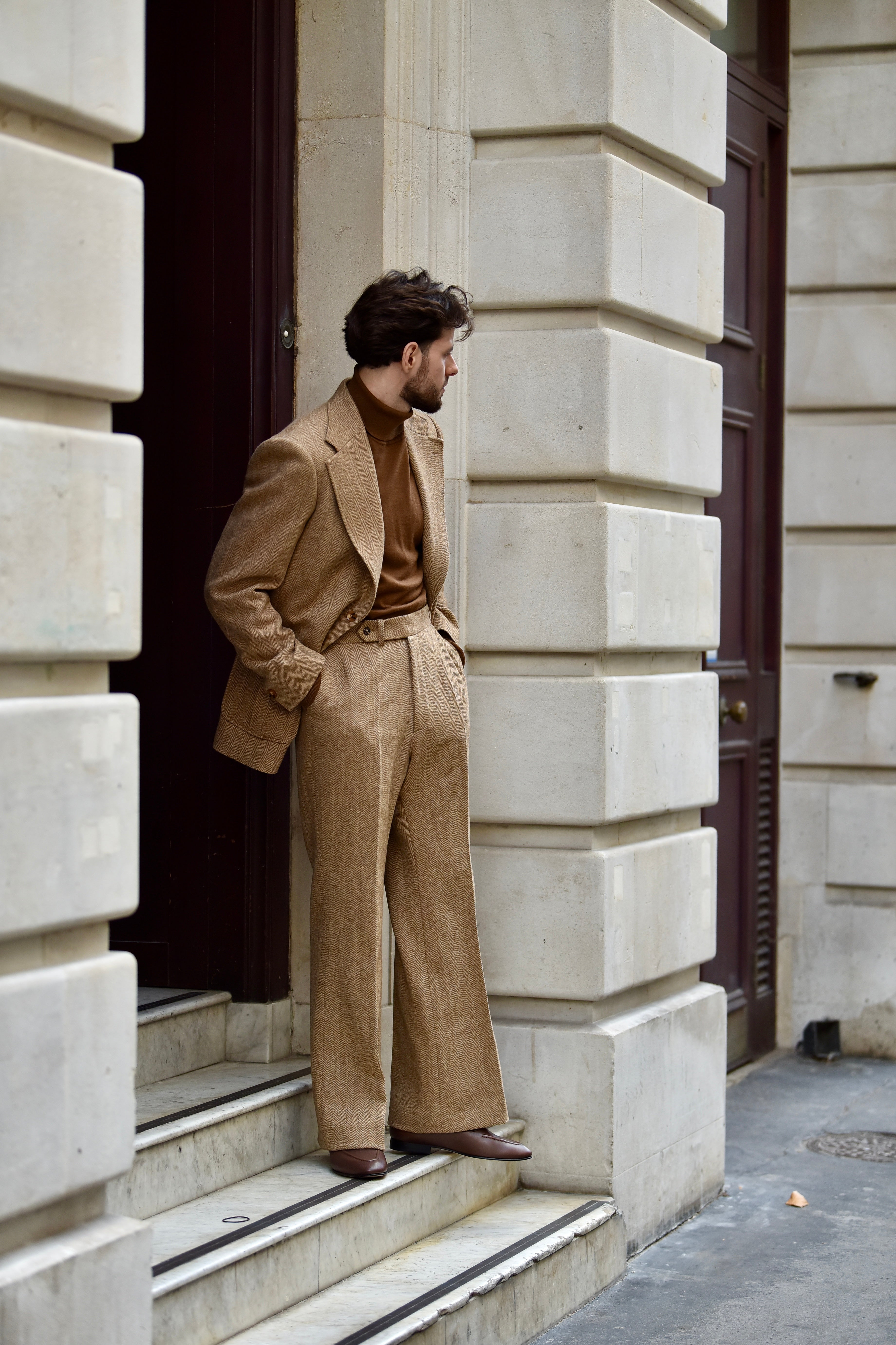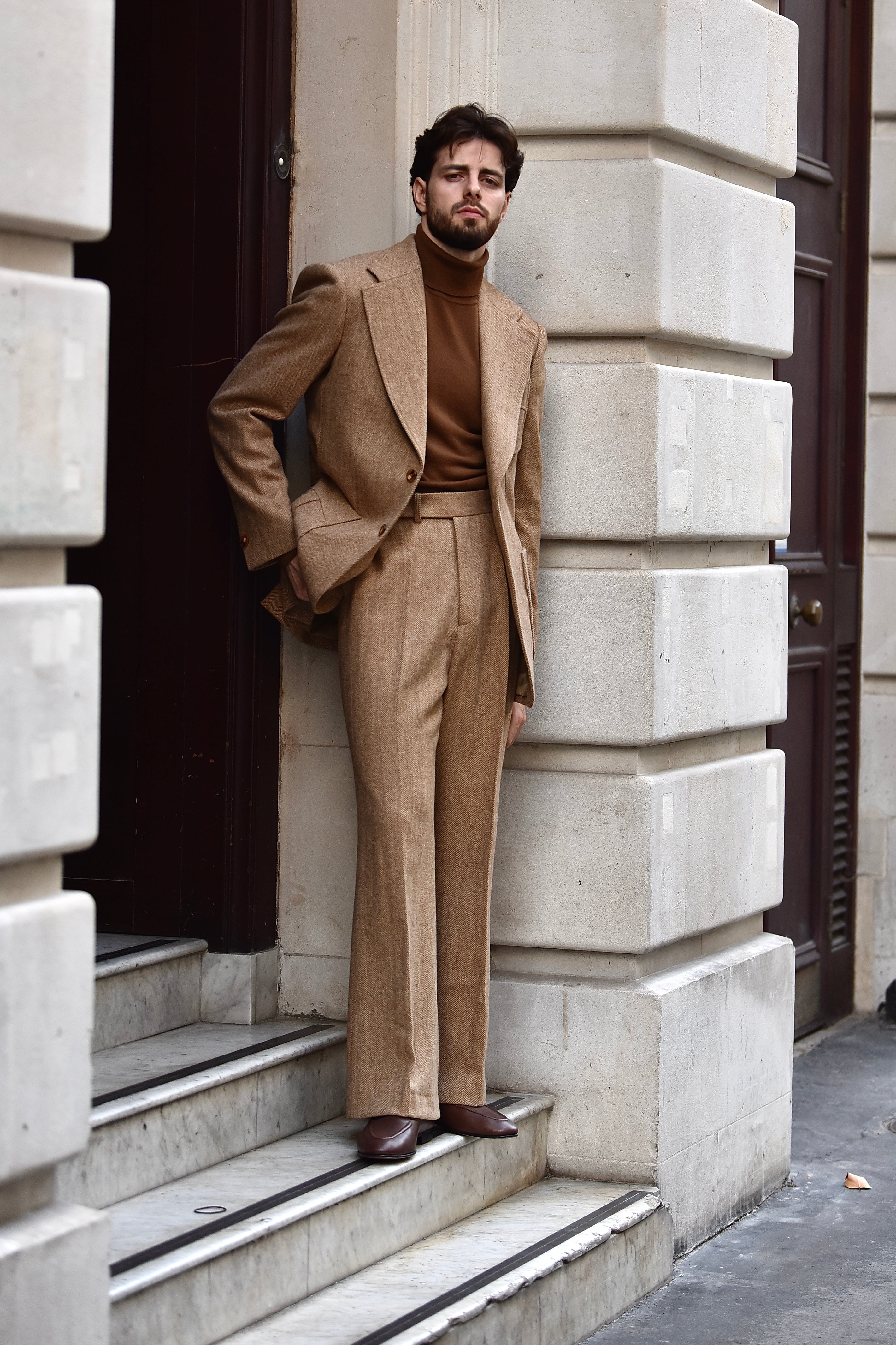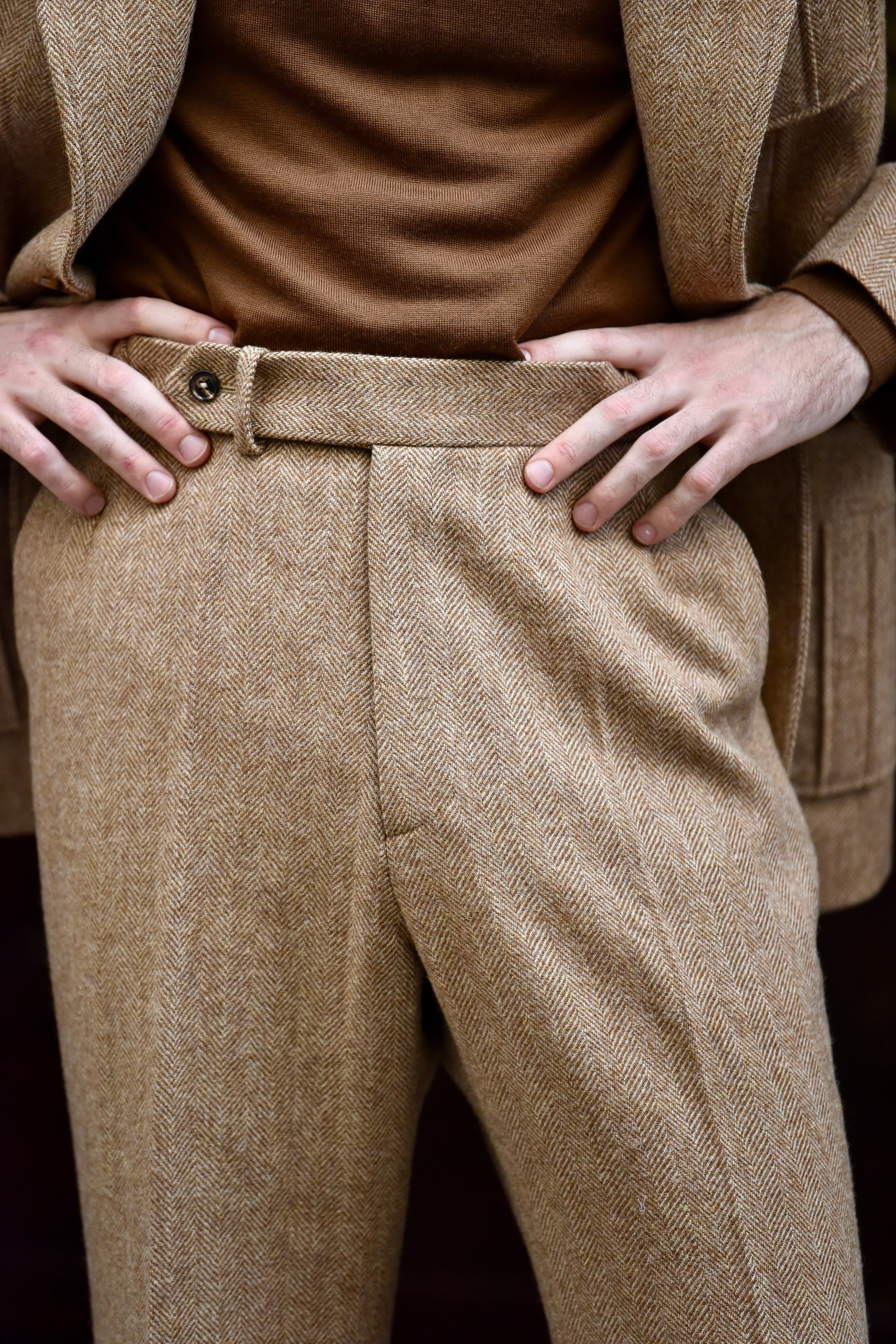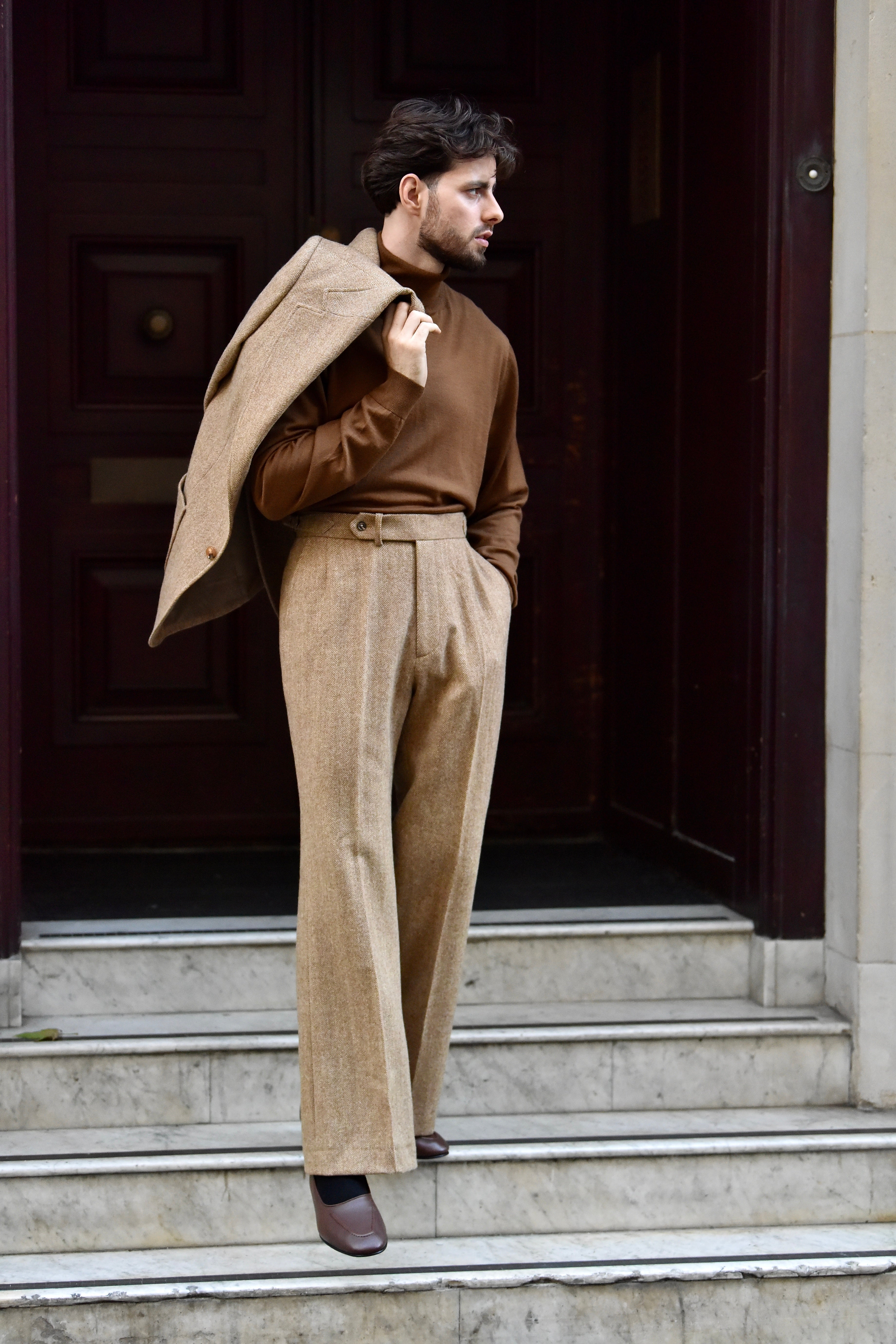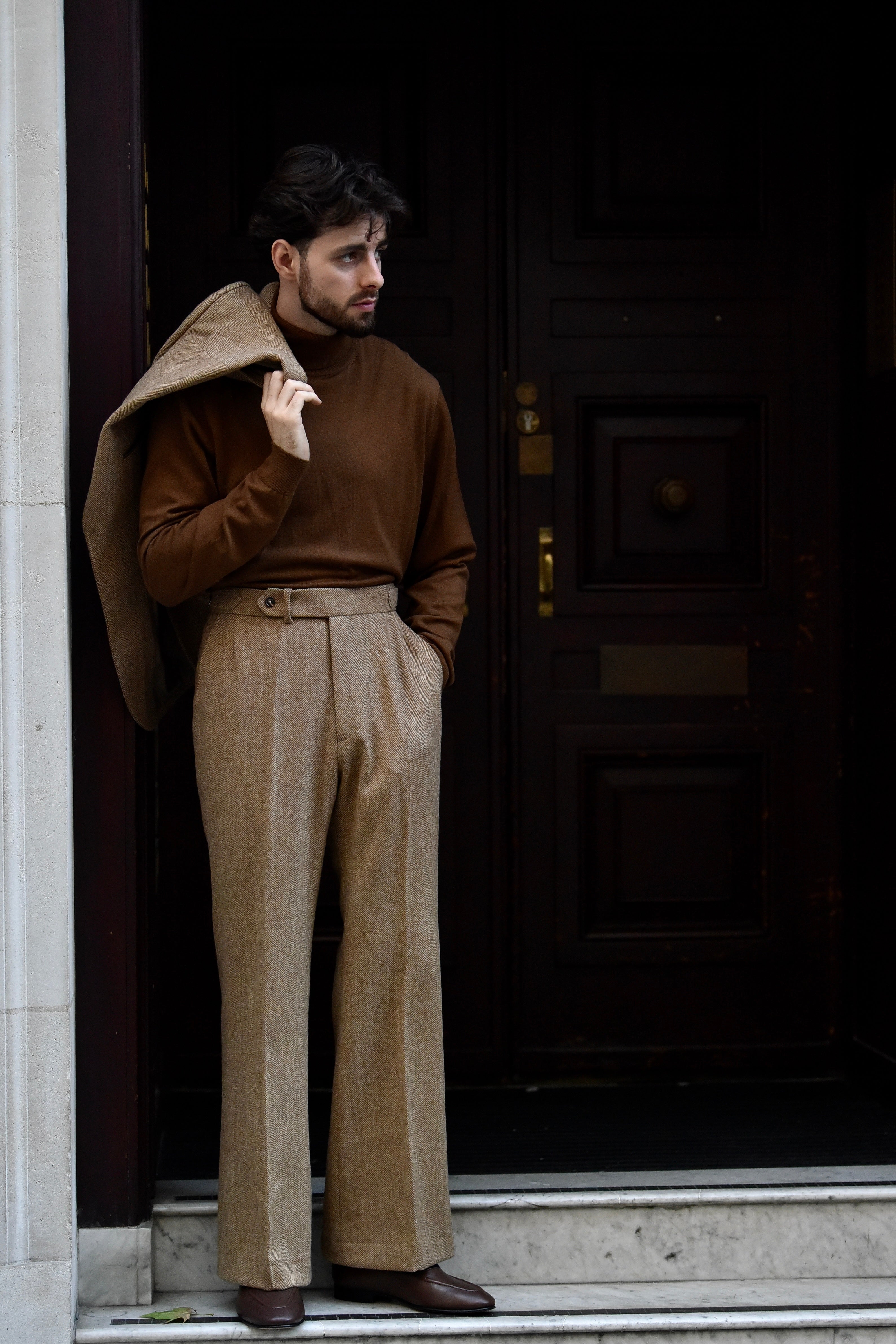 Introducing the Kent Pants—a refined blend of retro inspiration and modern tailoring. Crafted from luxurious camel herringbone wool, these pants pay homage to classic '70s style with an updated silhouette. Designed with a slight flare, they elongate the leg and create a flattering, sophisticated profile. The soft, textured fabric adds warmth and depth, while the tailored cut sits comfortably at the waist, providing structure and a polished fit. Perfect for elevating your seasonal wardrobe, the Kent Pants offer timeless elegance that pairs effortlessly with everything from chunky knits to sleek blazers