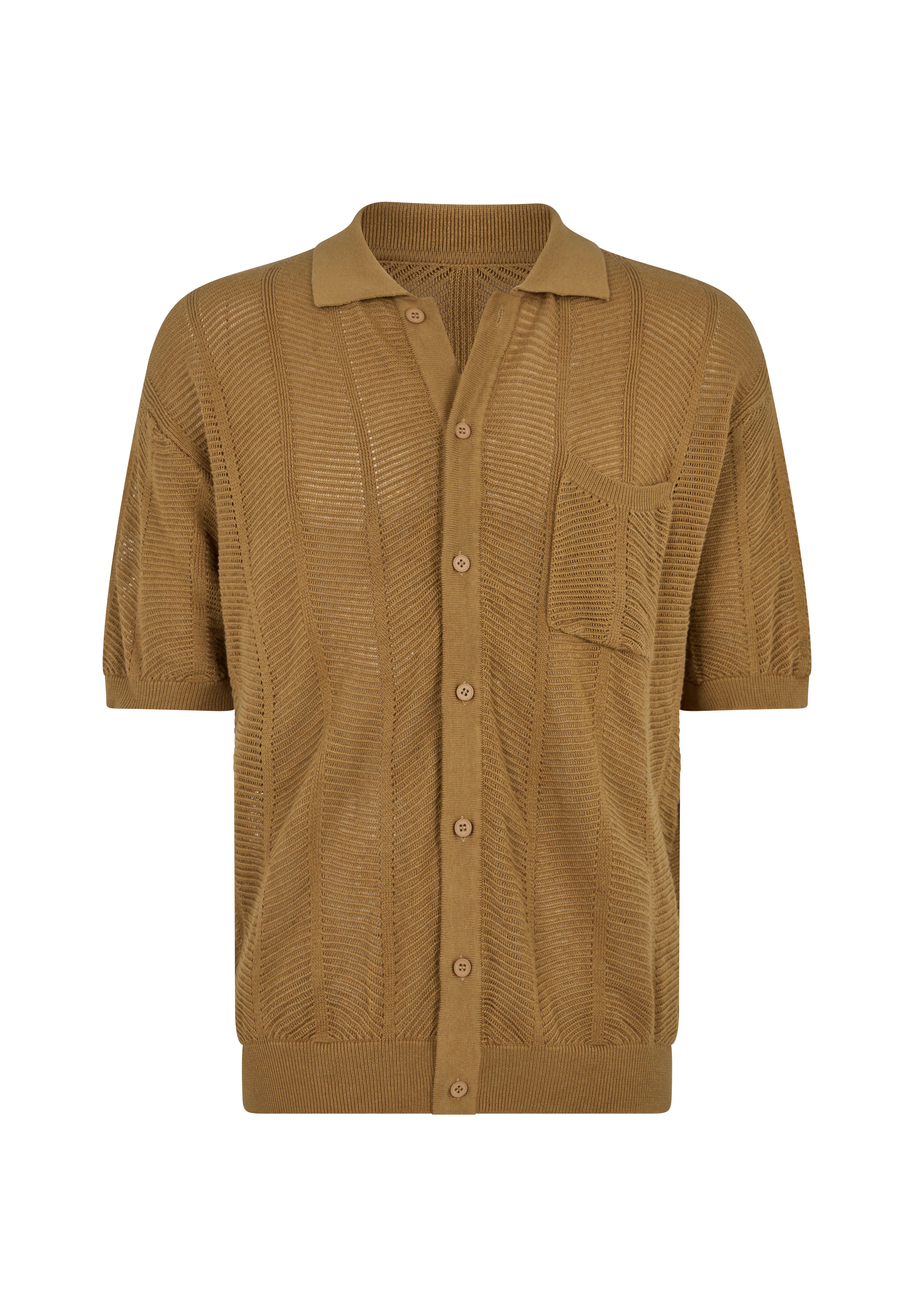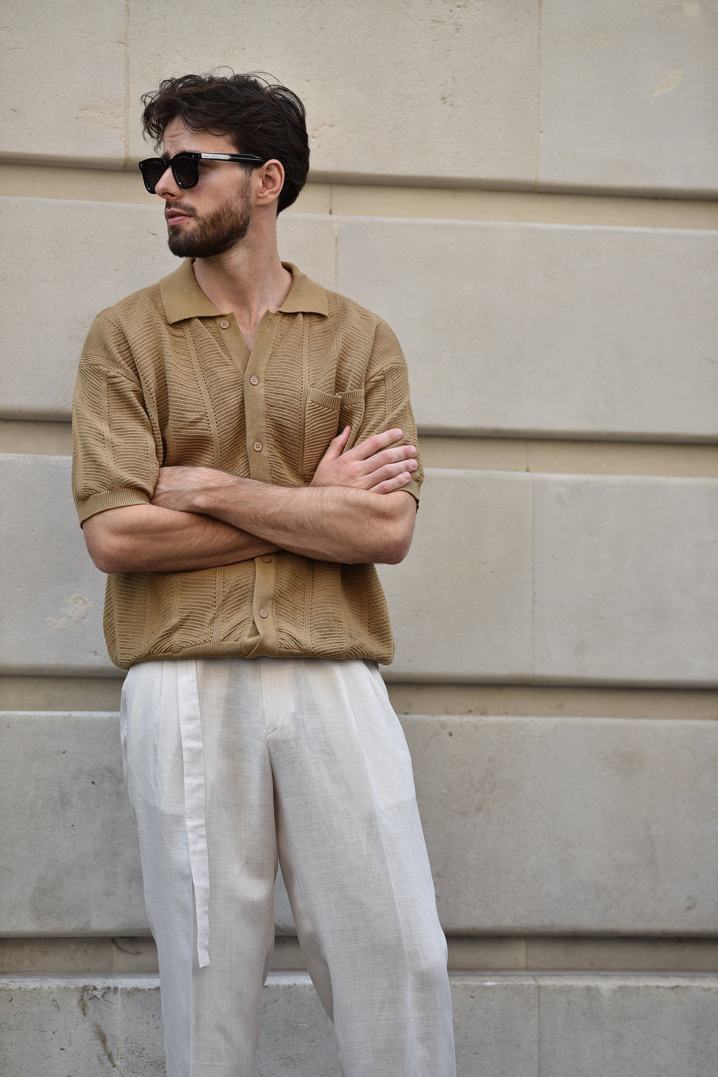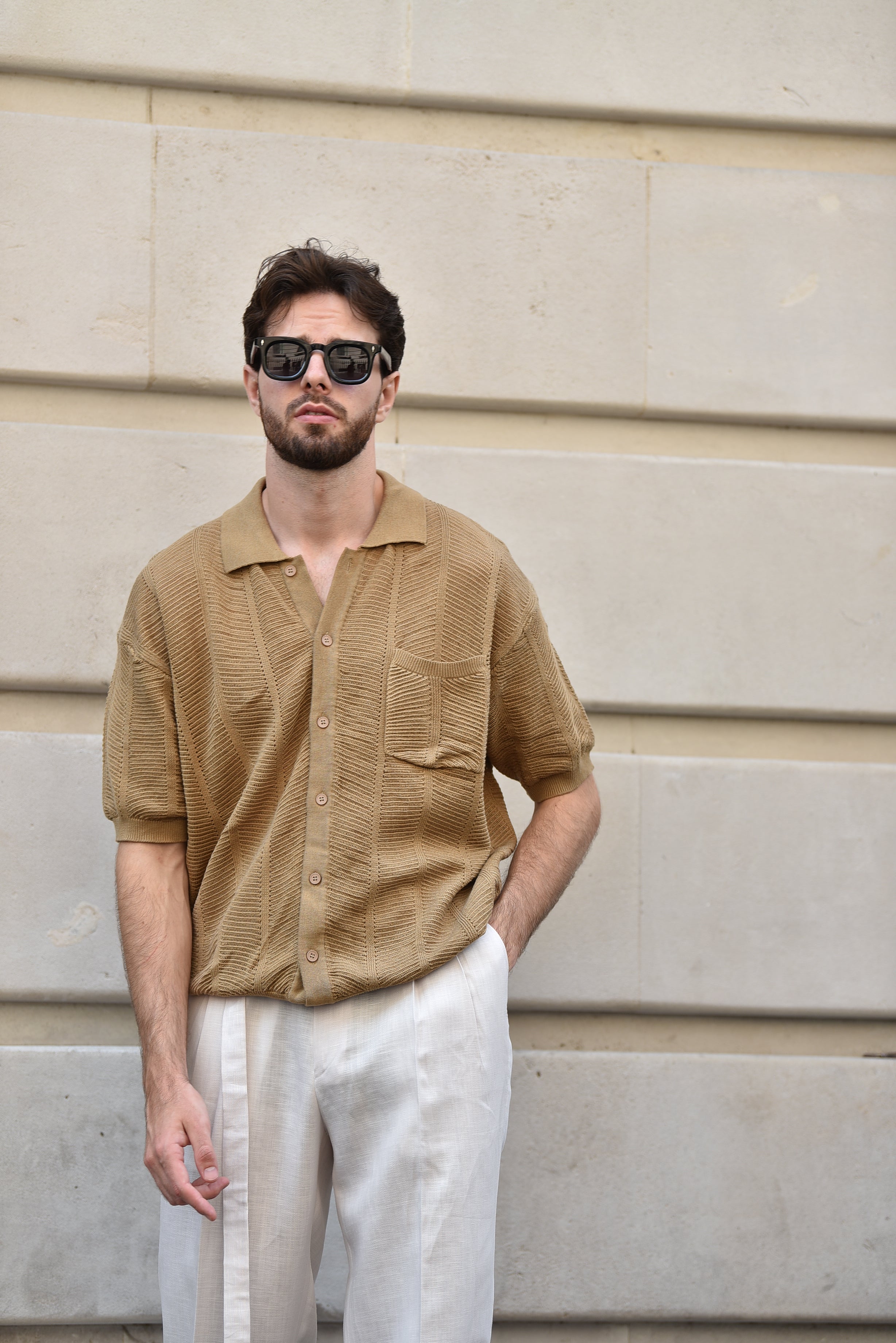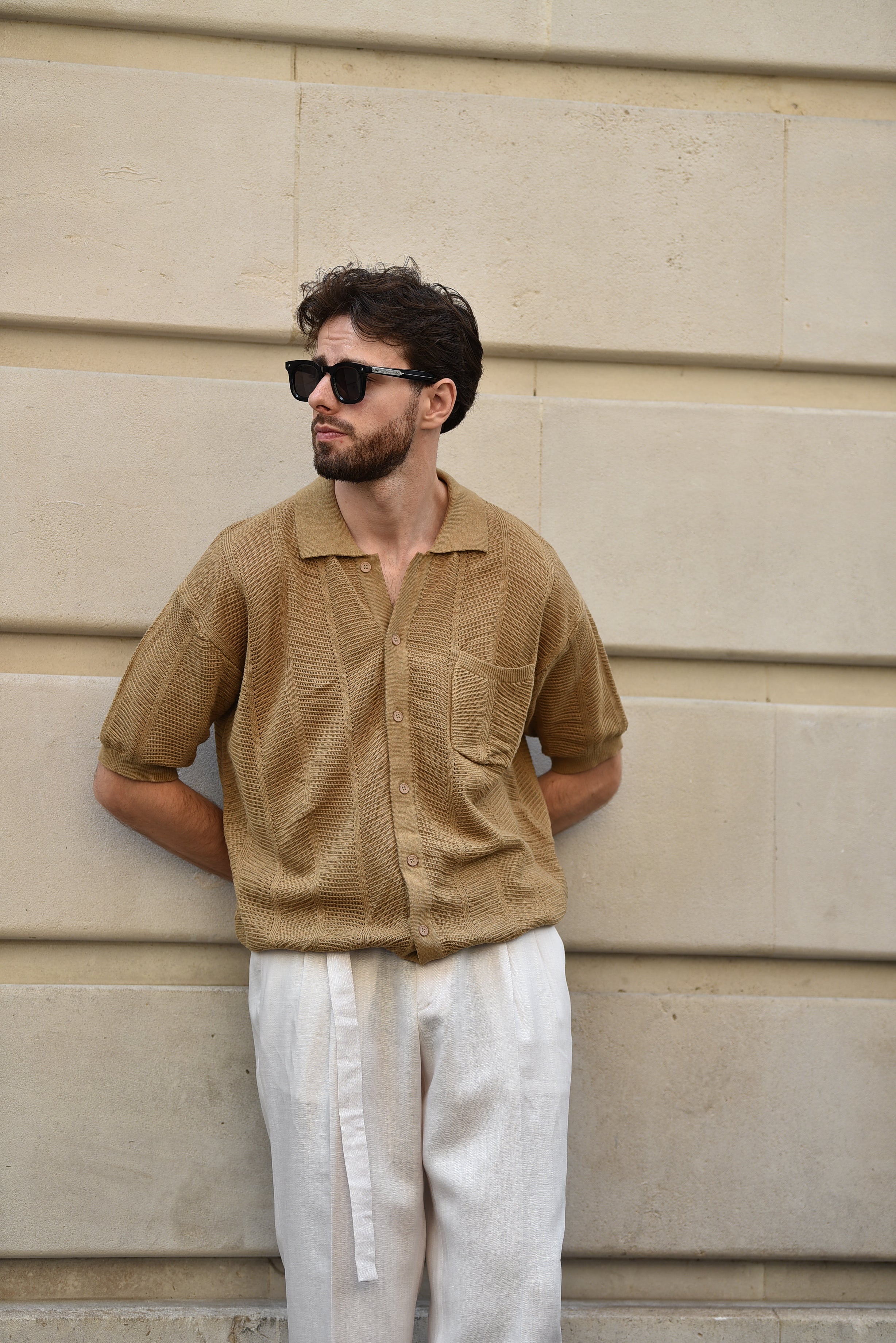 Crafted from 100% premium cotton yarn, the Marais Shirt combines breathable comfort with elevated texture. This short-sleeve, button-up knit features a tailored silhouette and a single chest pocket for subtle utility. Designed in a classic beige with refined navy outlines, it offers effortless versatility—perfect worn on its own or layered as an overshirt. Whether paired with relaxed trousers or smart denim, the Marais adds a sophisticated edge to any casual or smart-casual ensemble.