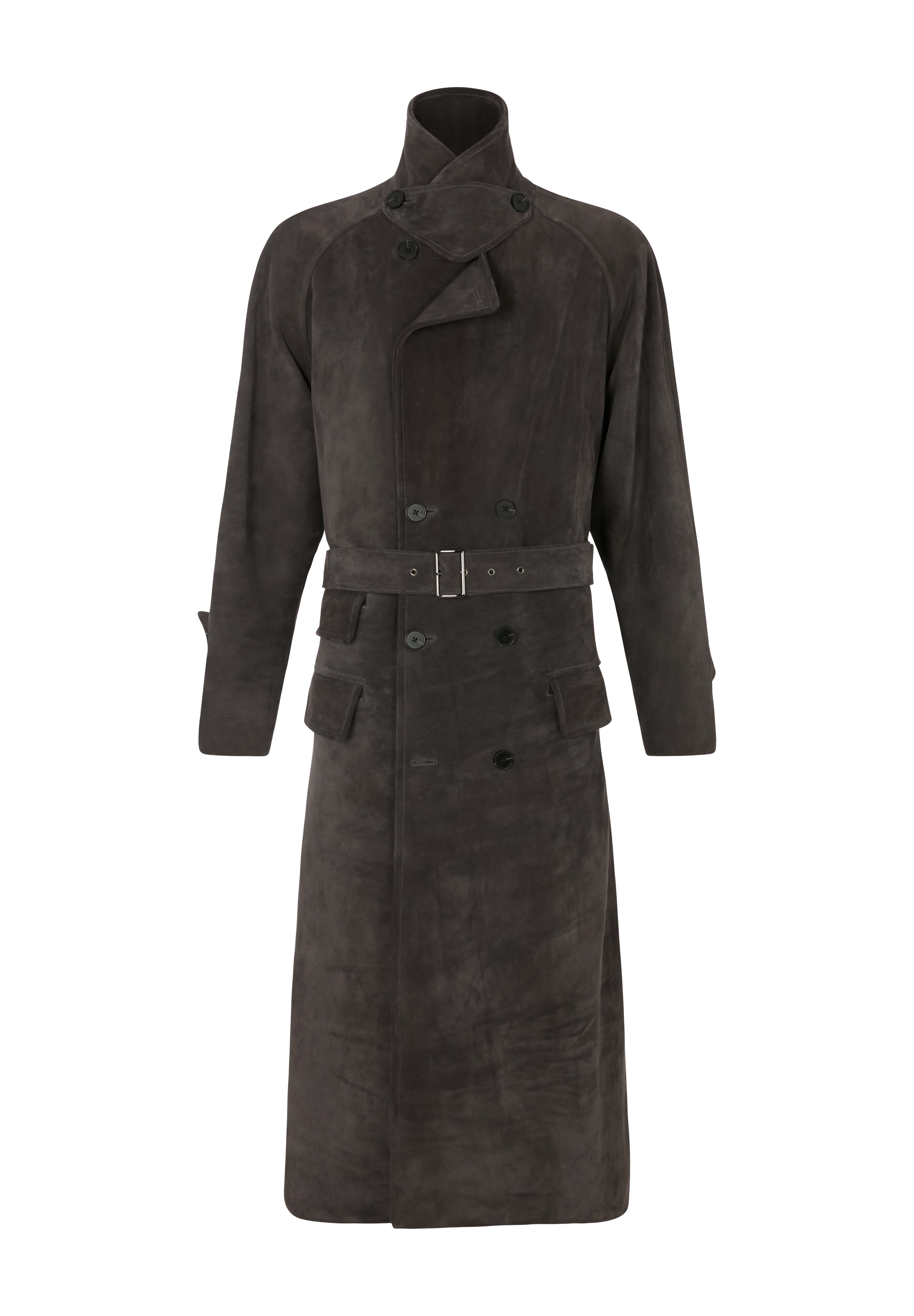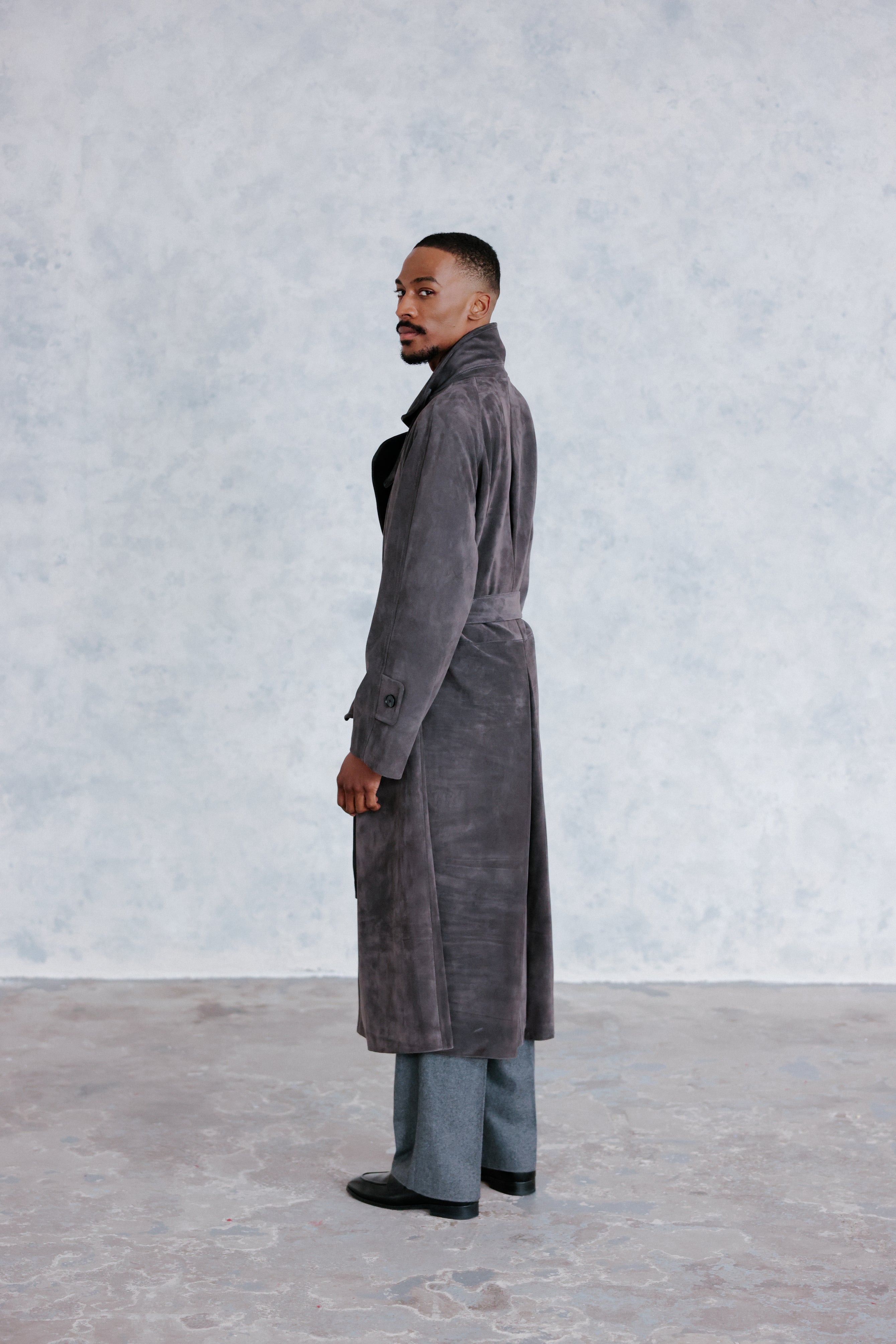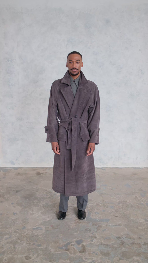 The Midori Trench Coat in grey suede embodies a refined balance of craftsmanship and modern elegance. Tailored from supple, fine grade suede, it offers a velvety softness that enhances its fluid drape, allowing the coat to move with effortless grace. The natural texture of the suede lends depth and quiet luxury, giving the silhouette a sculpted yet understated presence.