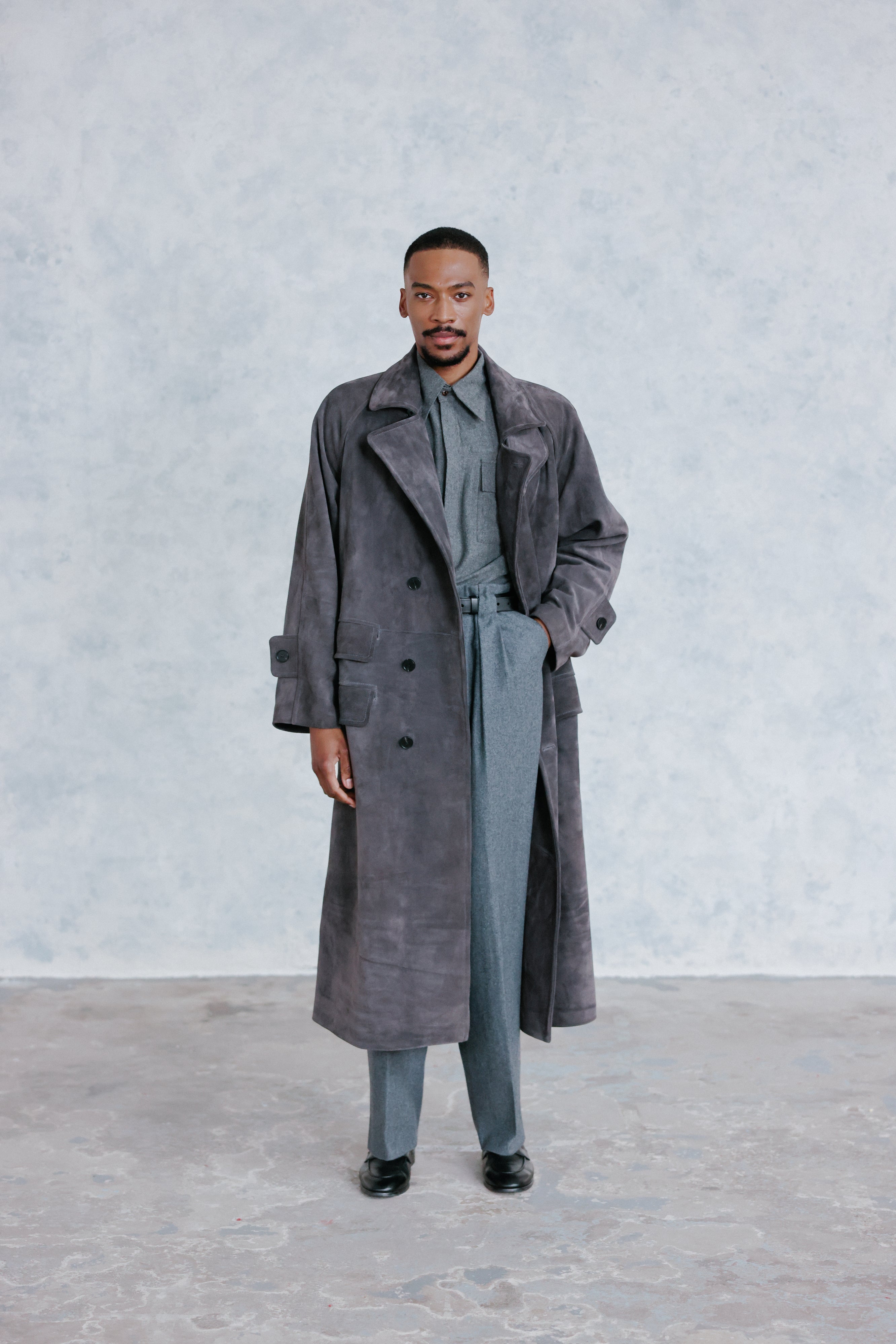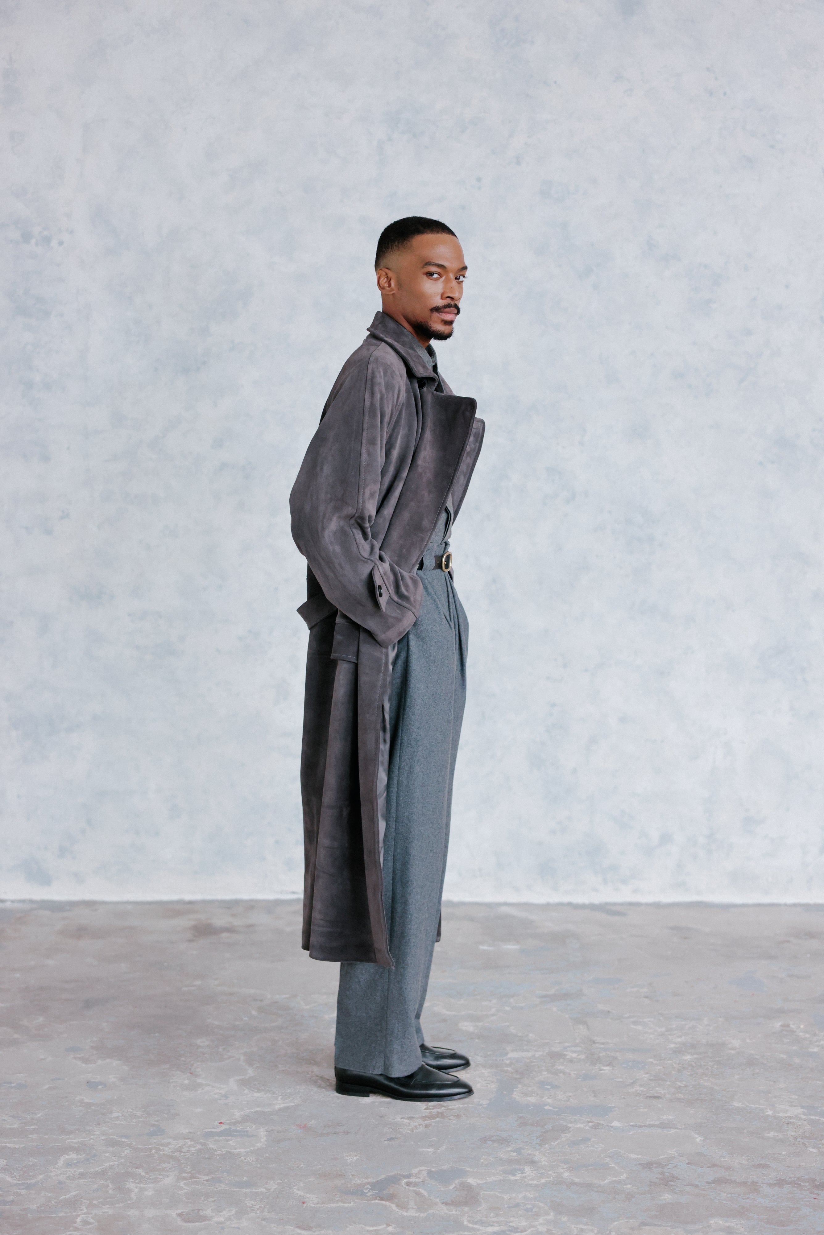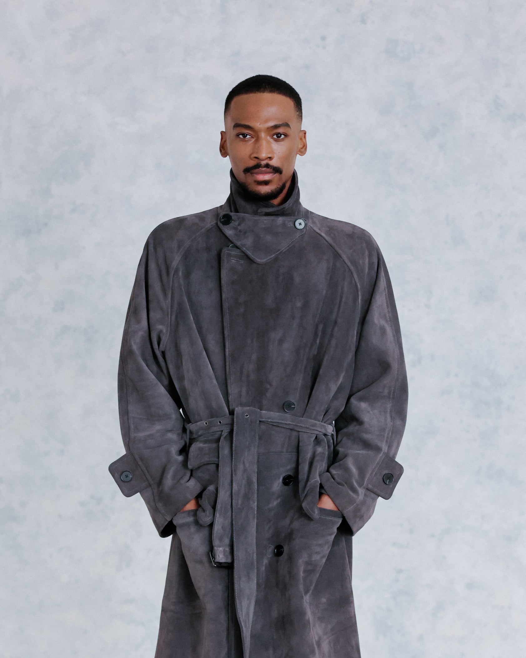 The Midori Trench Coat in grey suede embodies a refined balance of craftsmanship and modern elegance. Tailored from supple, fine grade suede, it offers a velvety softness that enhances its fluid drape, allowing the coat to move with effortless grace. The natural texture of the suede lends depth and quiet luxury, giving the silhouette a sculpted yet understated presence.