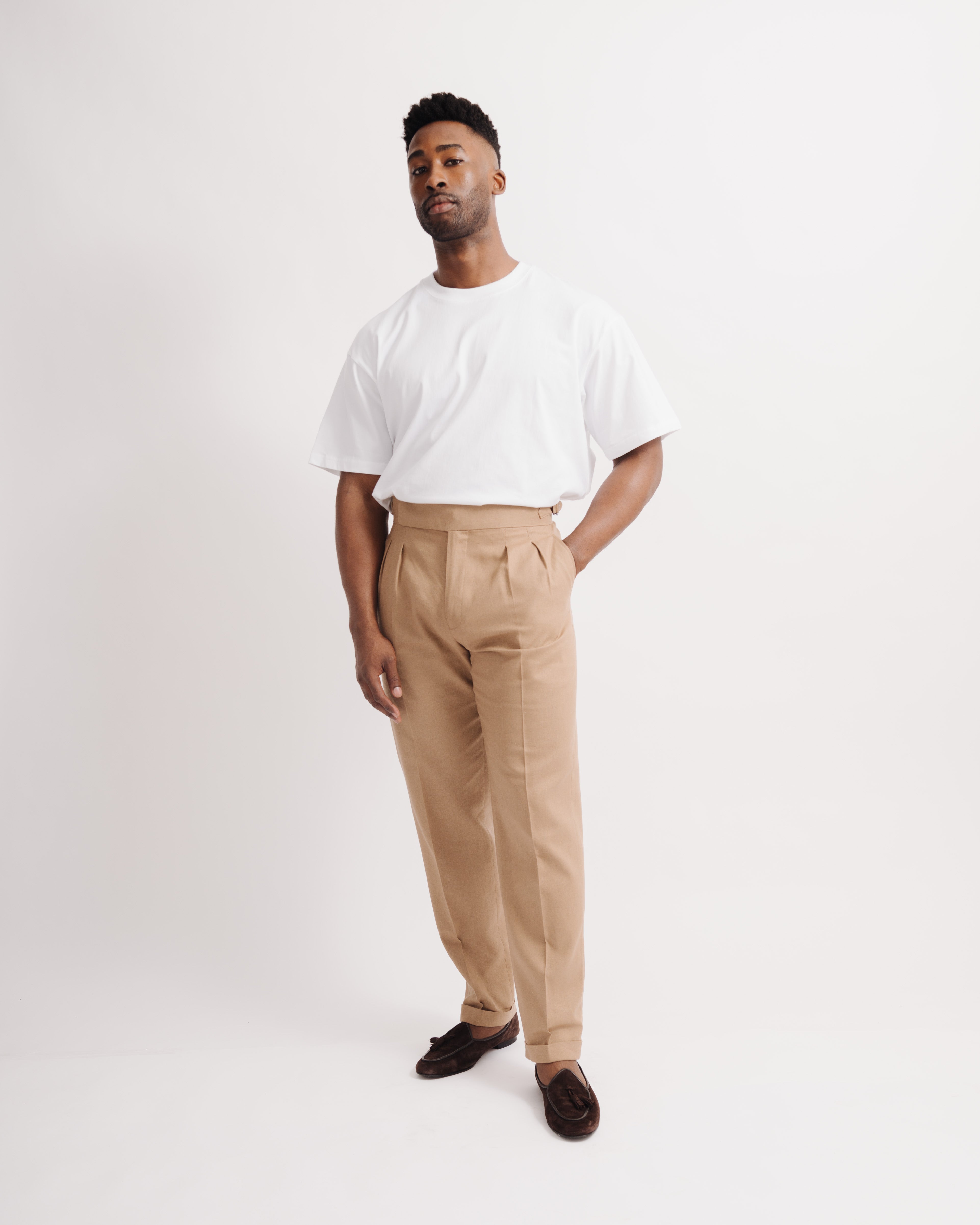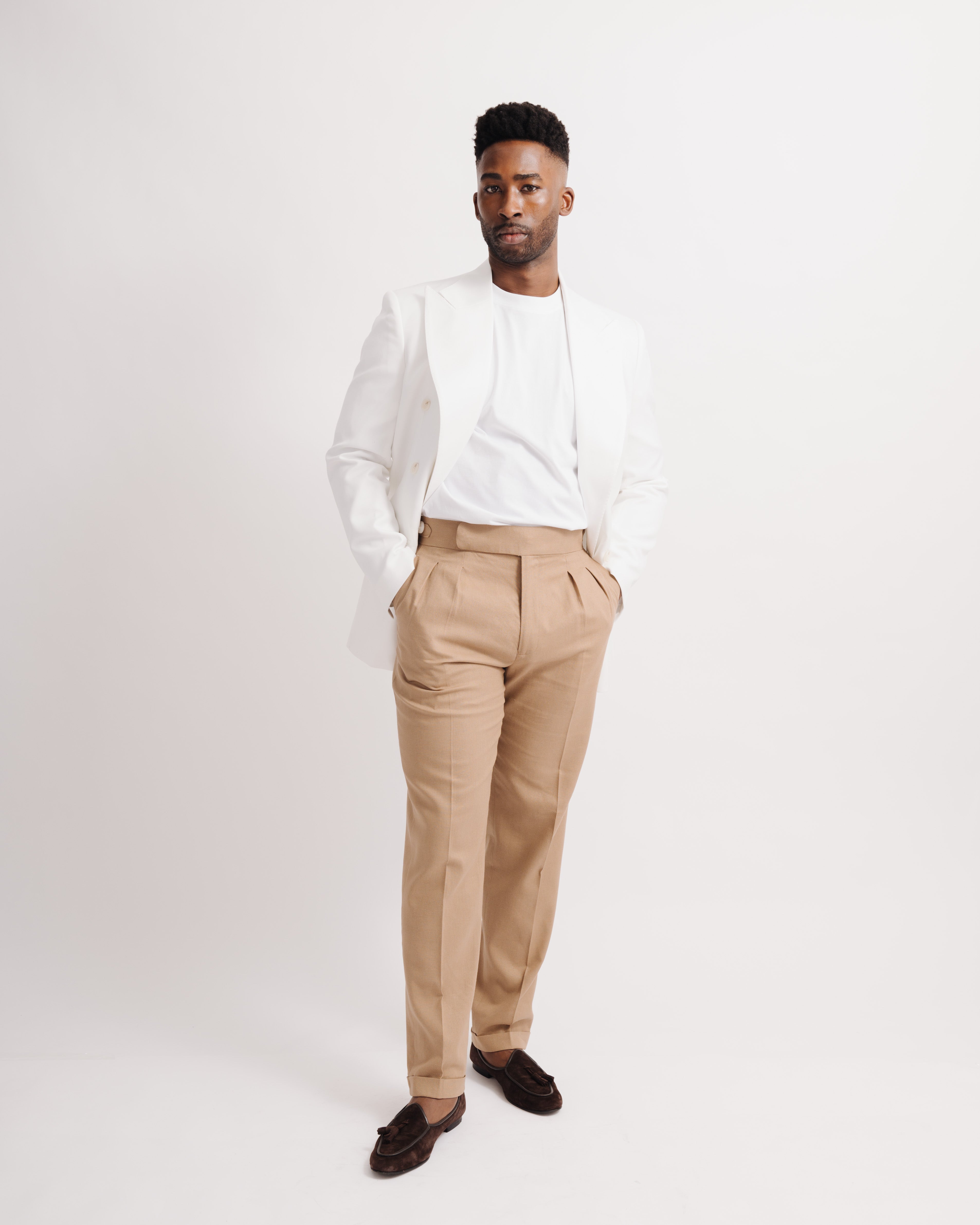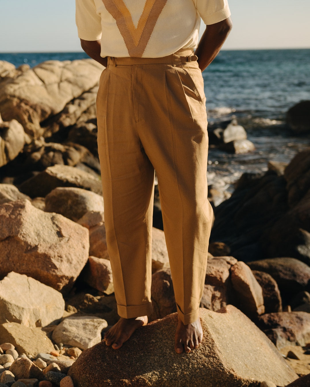 Our Mayfair Linen Pants are an essential for any fashion forward mans wardrobe. Made from an amazing beige linen cloth these pants give you the best of both worlds of street style & sartorial. Can be dressed up with a well tailored blazer & shirt or dressed down with a t-shirt and sandals, perfect for warmer temperatures.