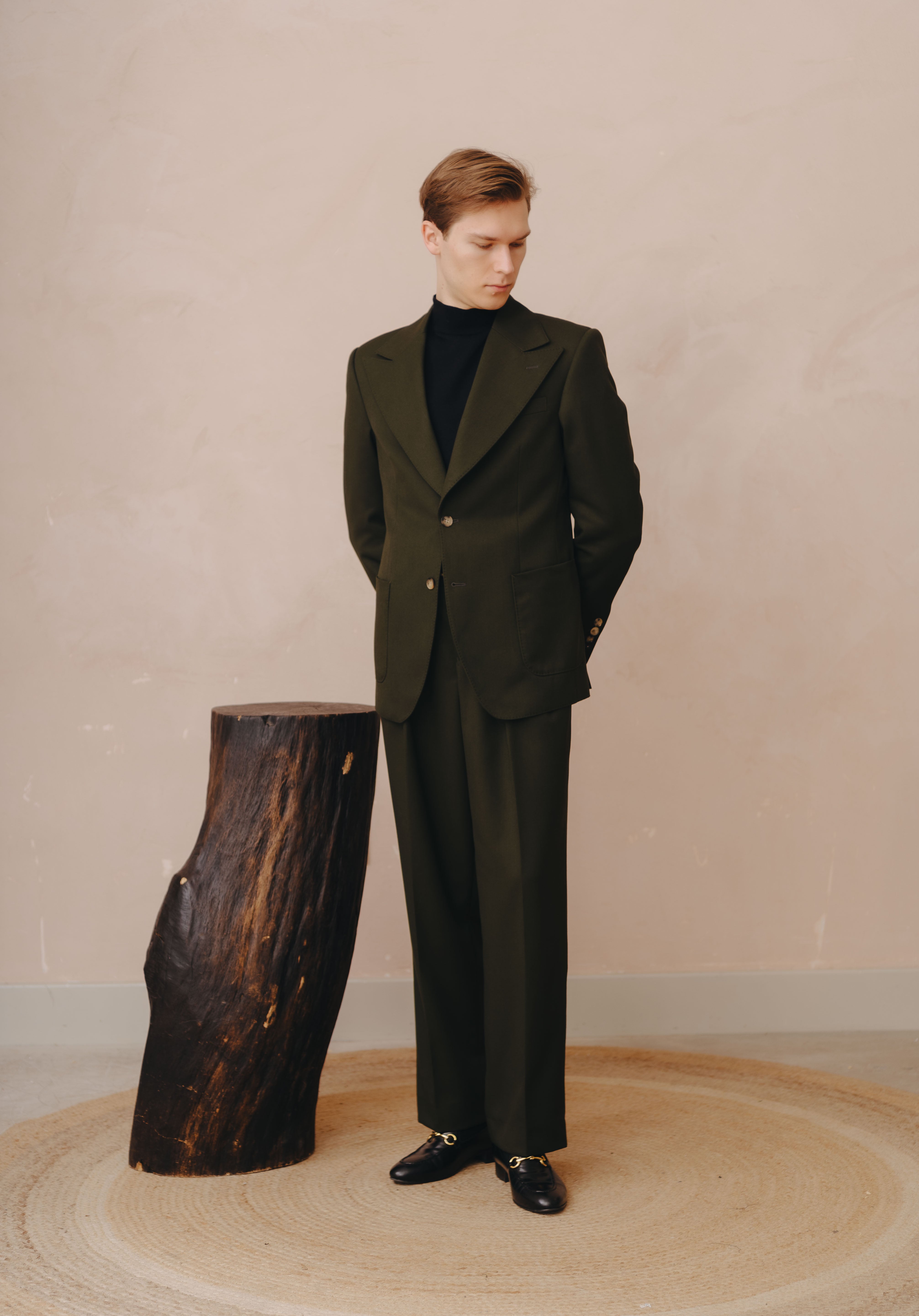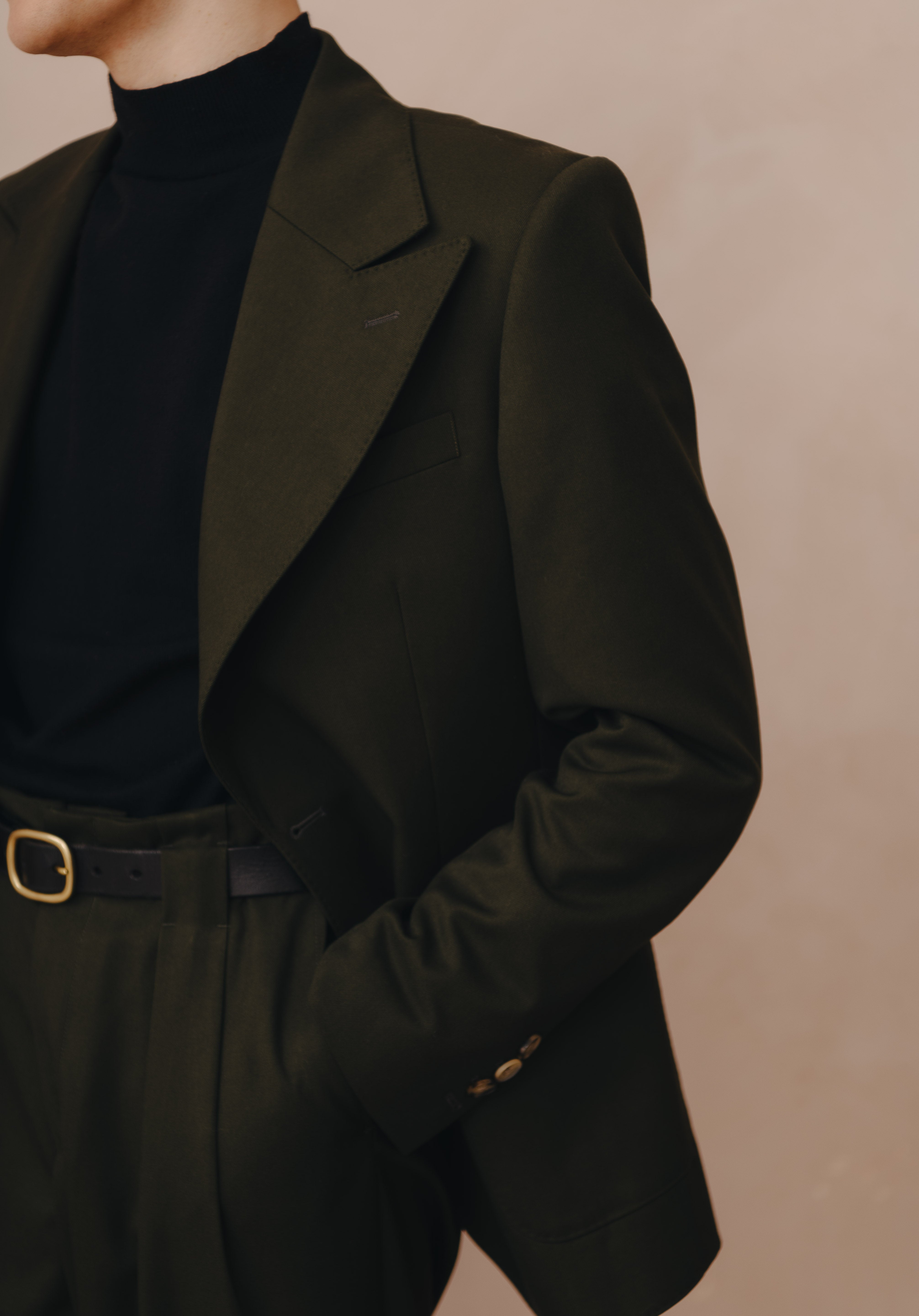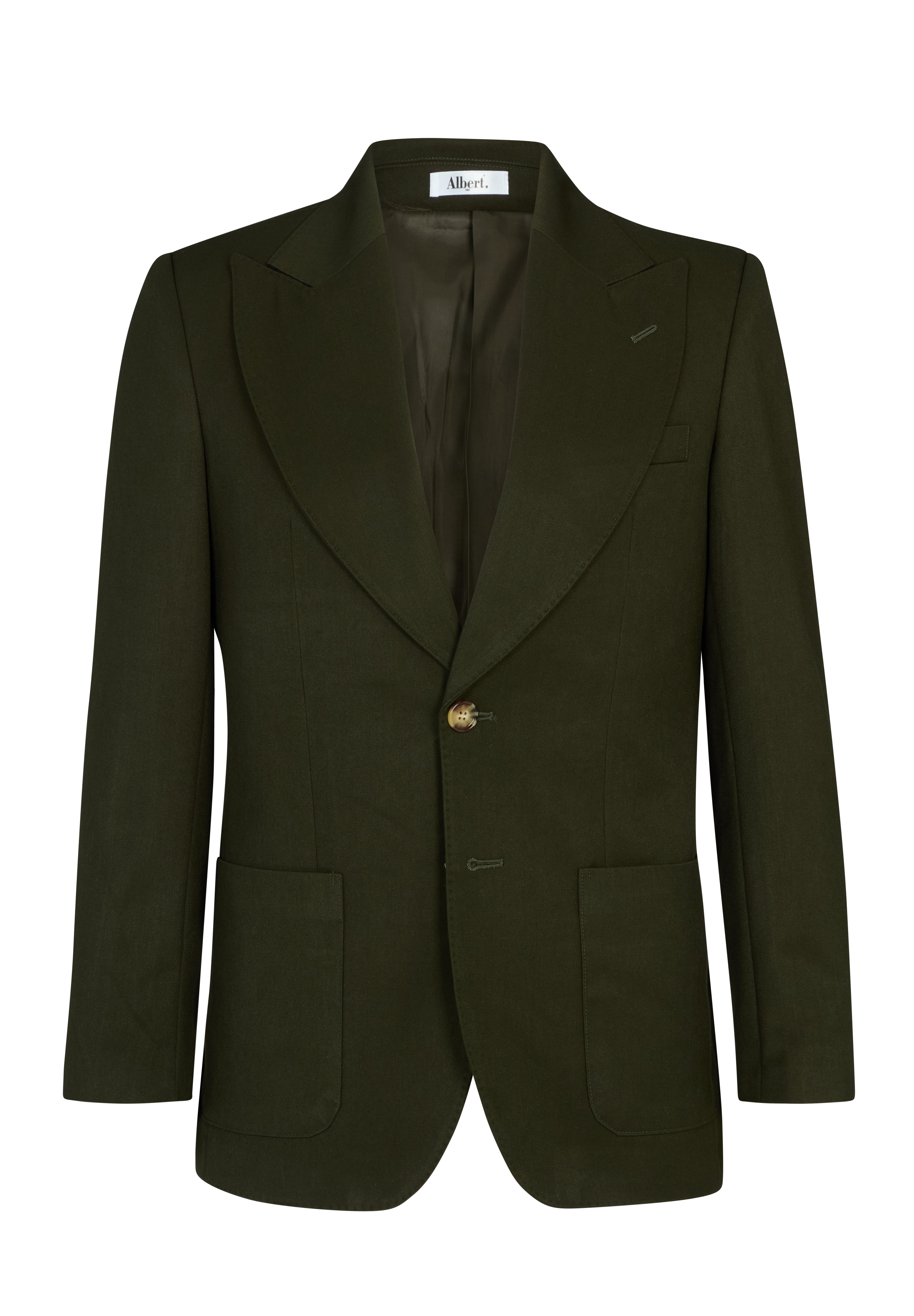 The Portobello Blazer is a standout item made for the fashion forward man. This tailored blazer is highly inspired by 1970's tailoring with its wide lapels and structured silhouette. The Portobello Blazer is made from a splendid Green wool cloth to execute a chic winter attire. Whether this blazer is worn for a formal or casual occasion it will certainly turn heads.