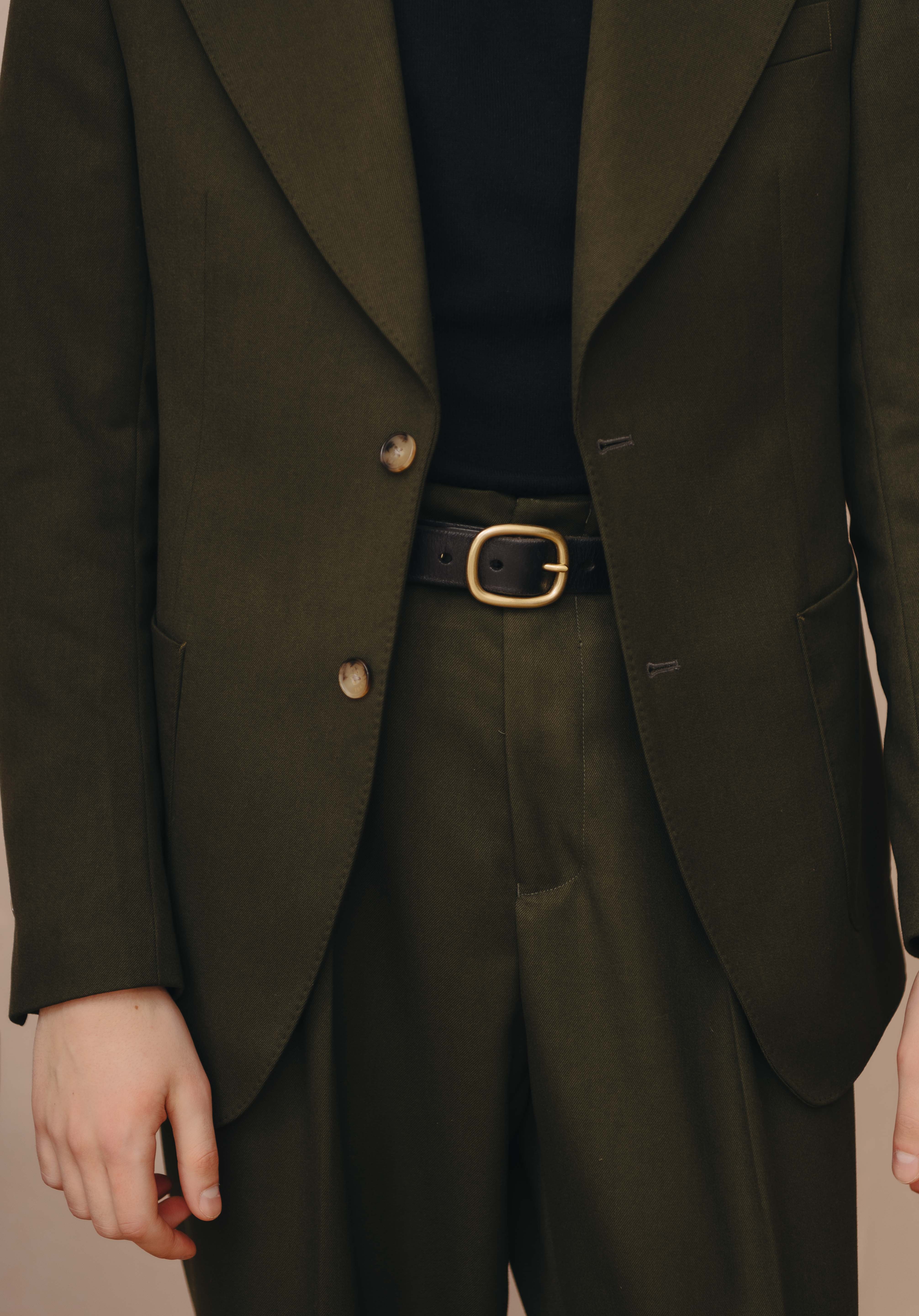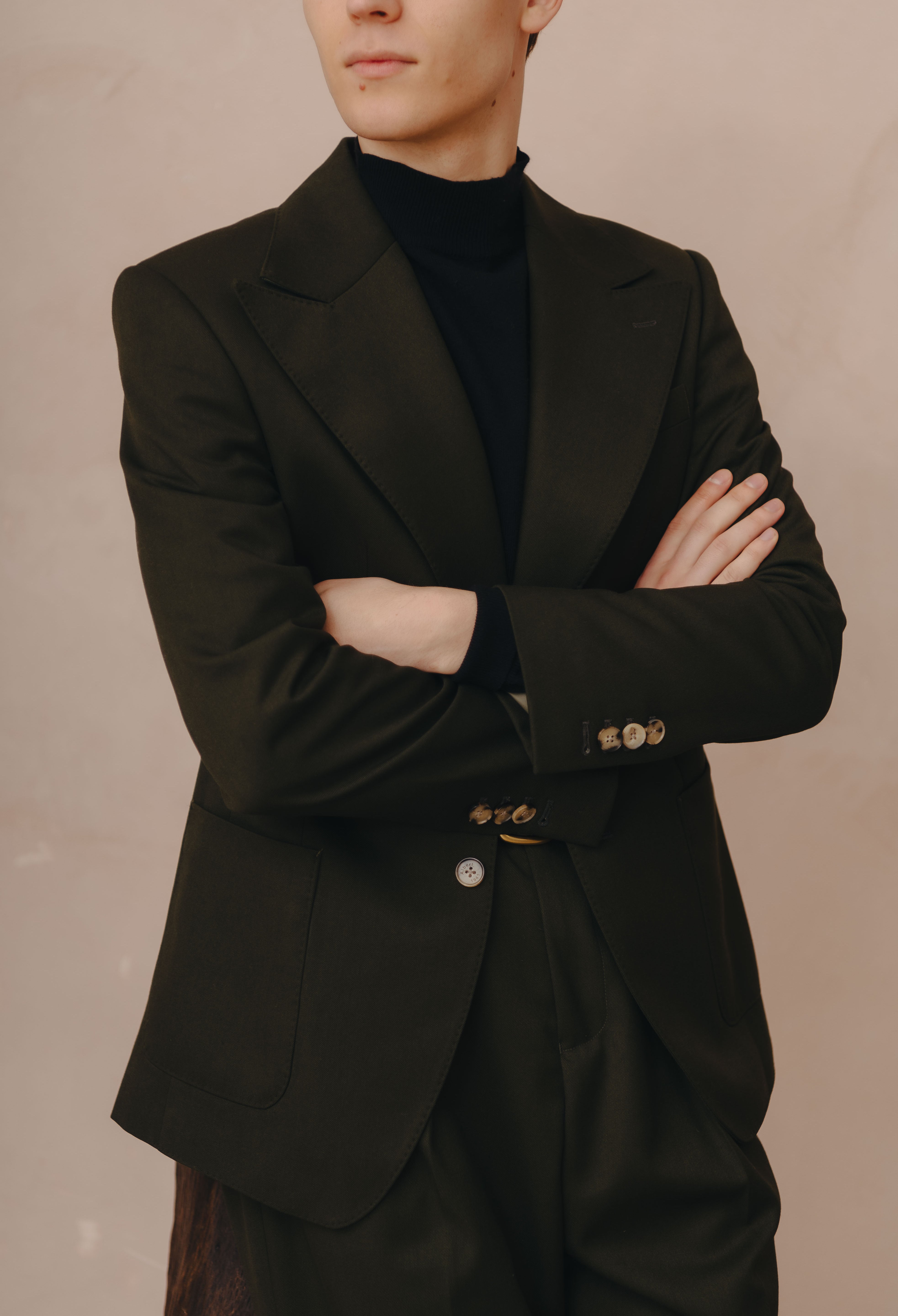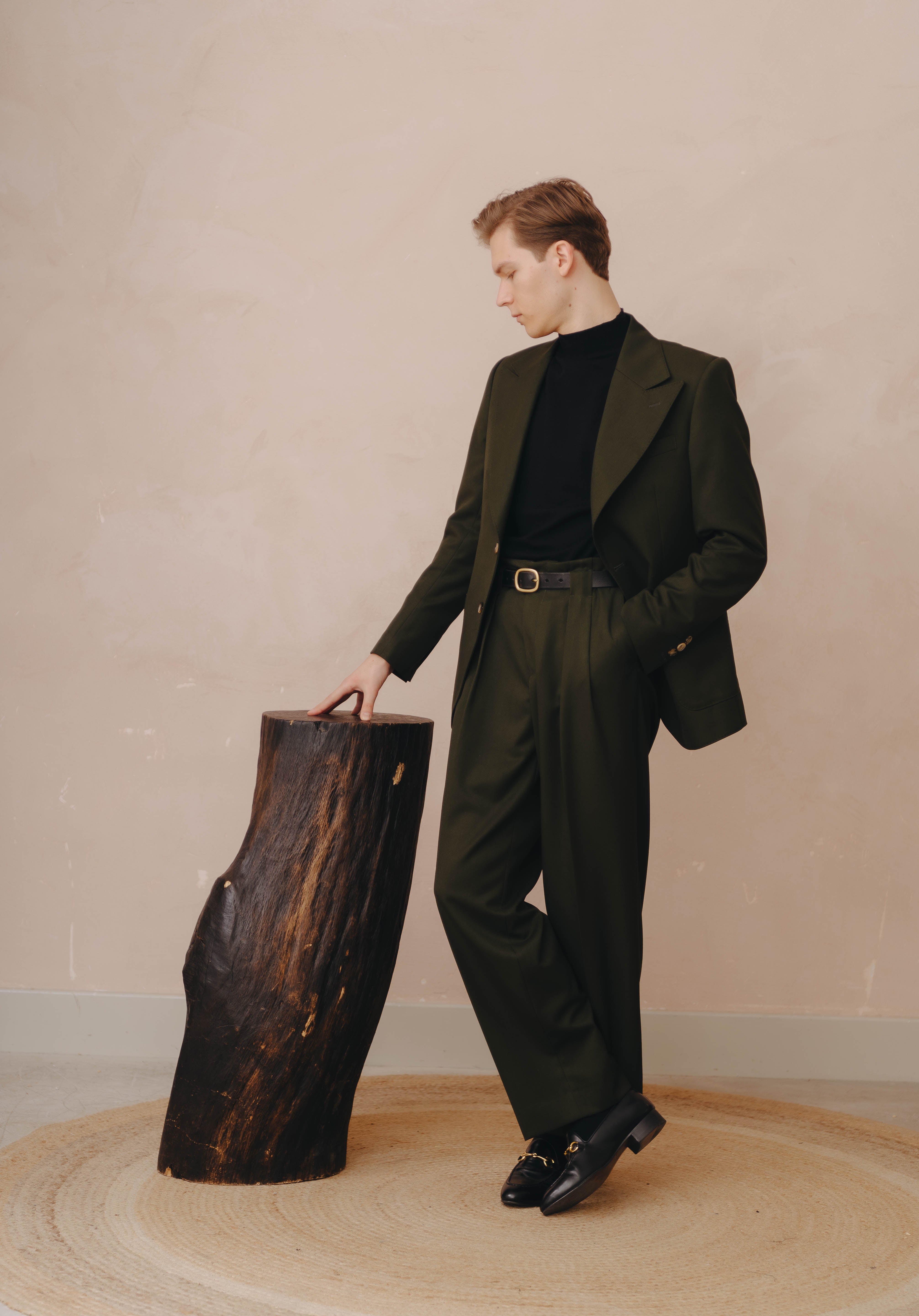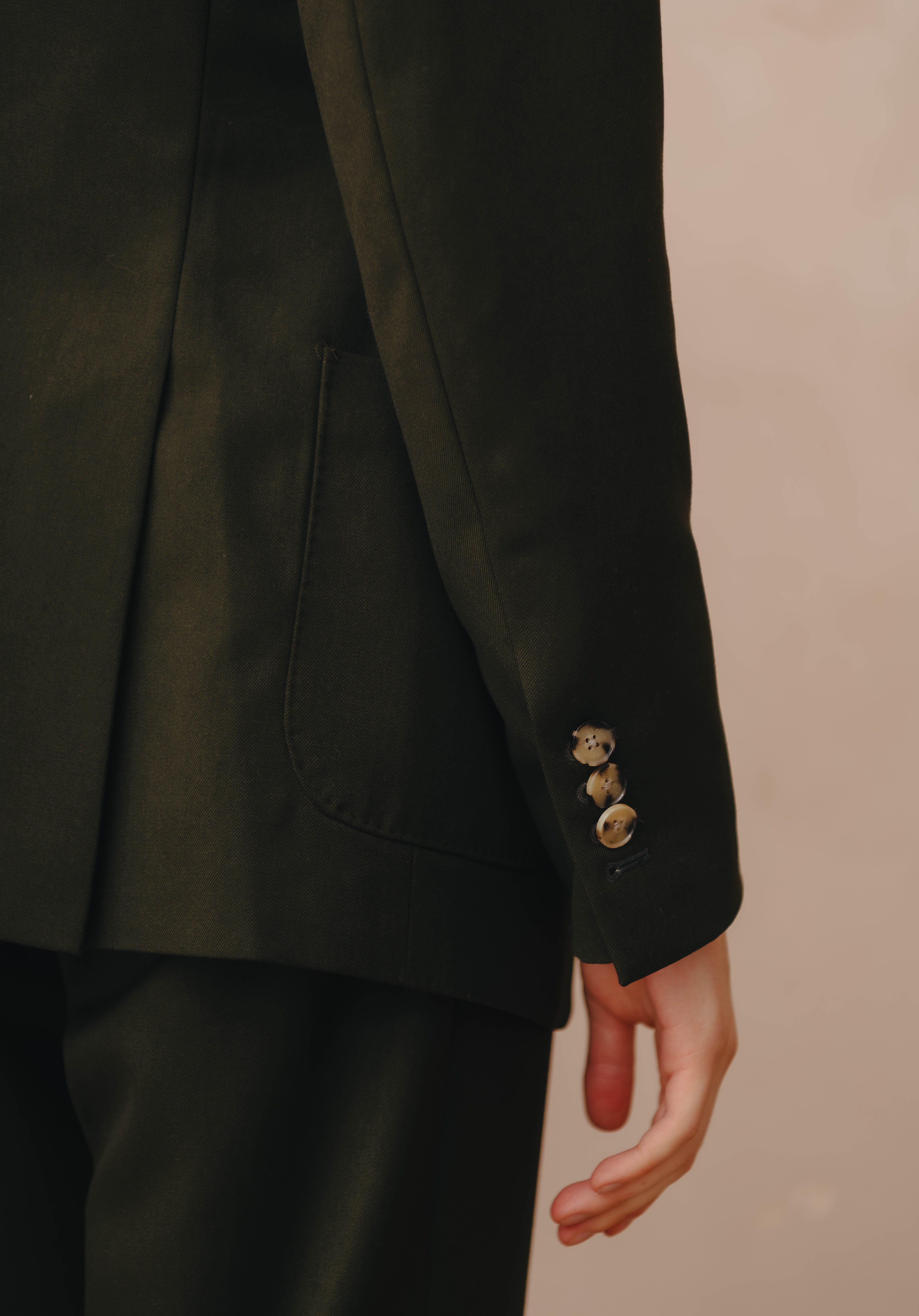 The Portobello Blazer is a standout item made for the fashion forward man. This tailored blazer is highly inspired by 1970's tailoring with its wide lapels and structured silhouette. The Portobello Blazer is made from a splendid Green wool cloth to execute a chic winter attire. Whether this blazer is worn for a formal or casual occasion it will certainly turn heads.