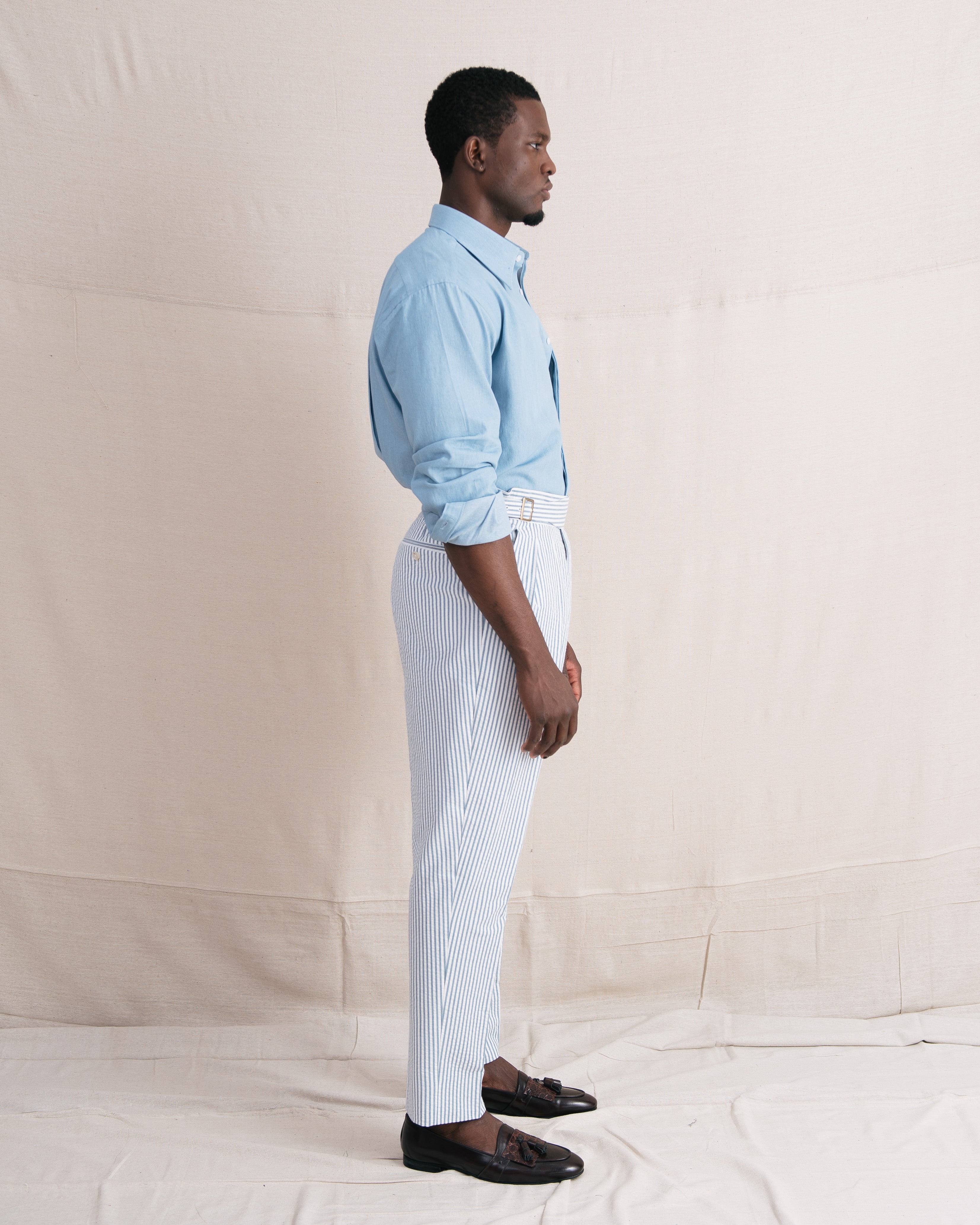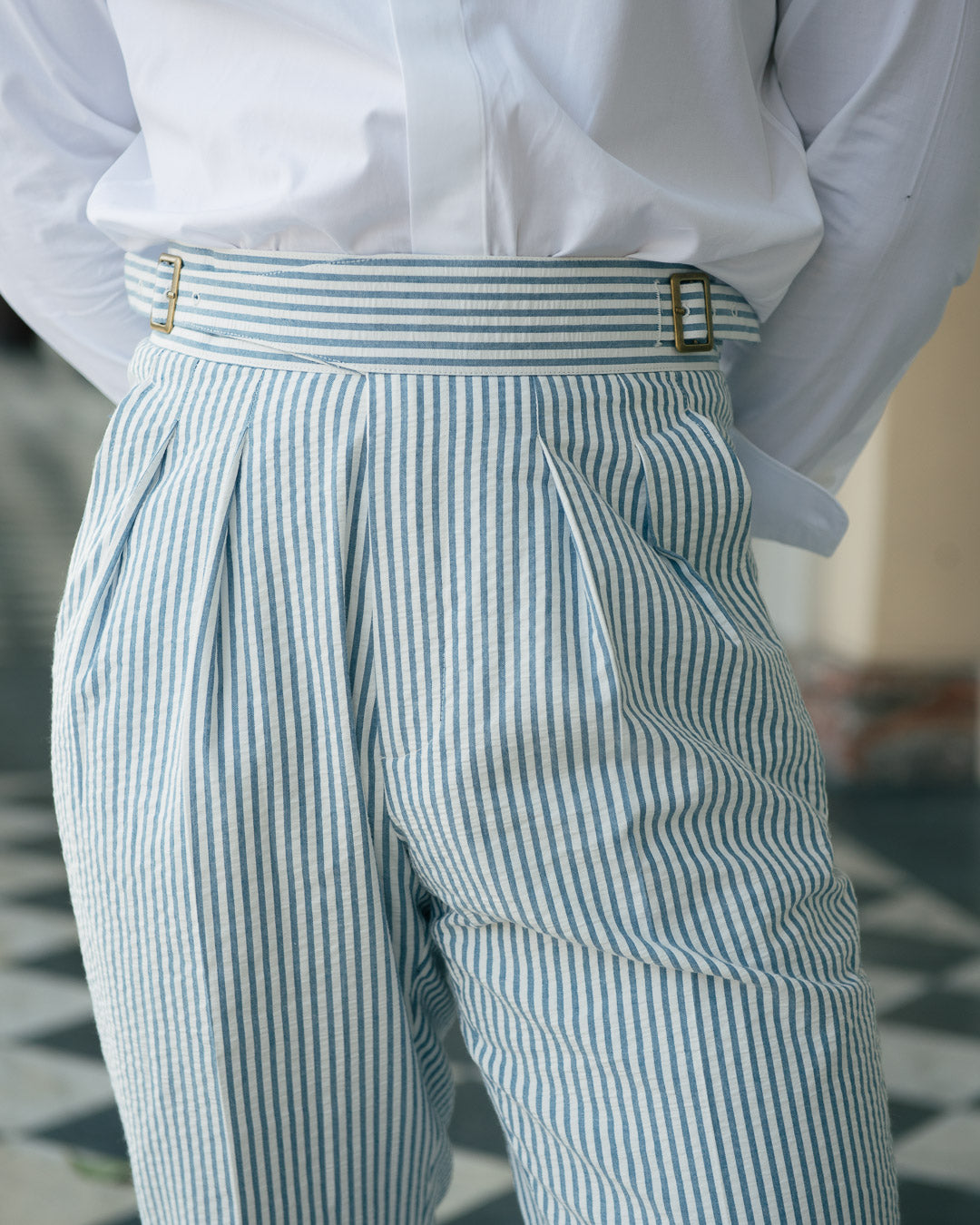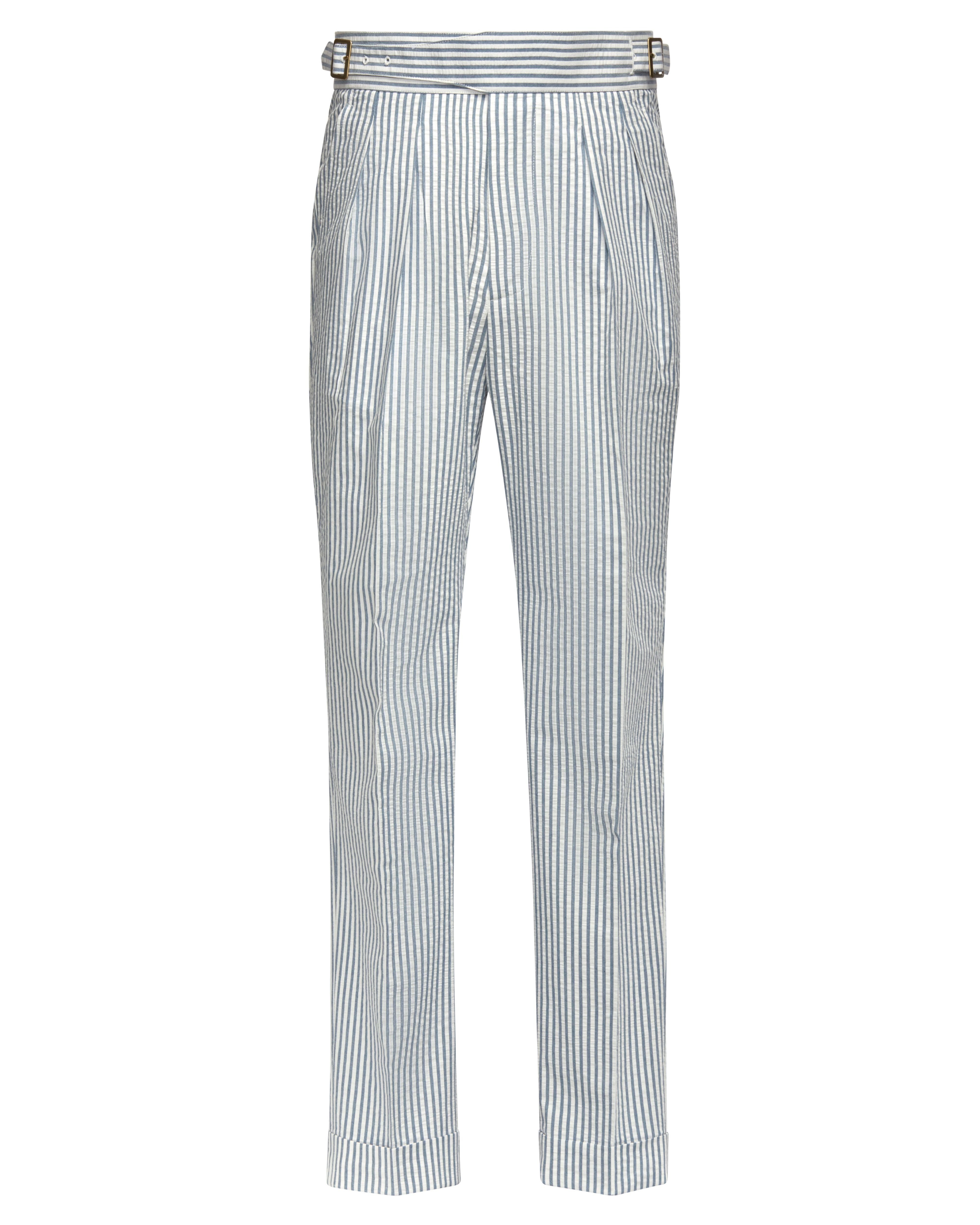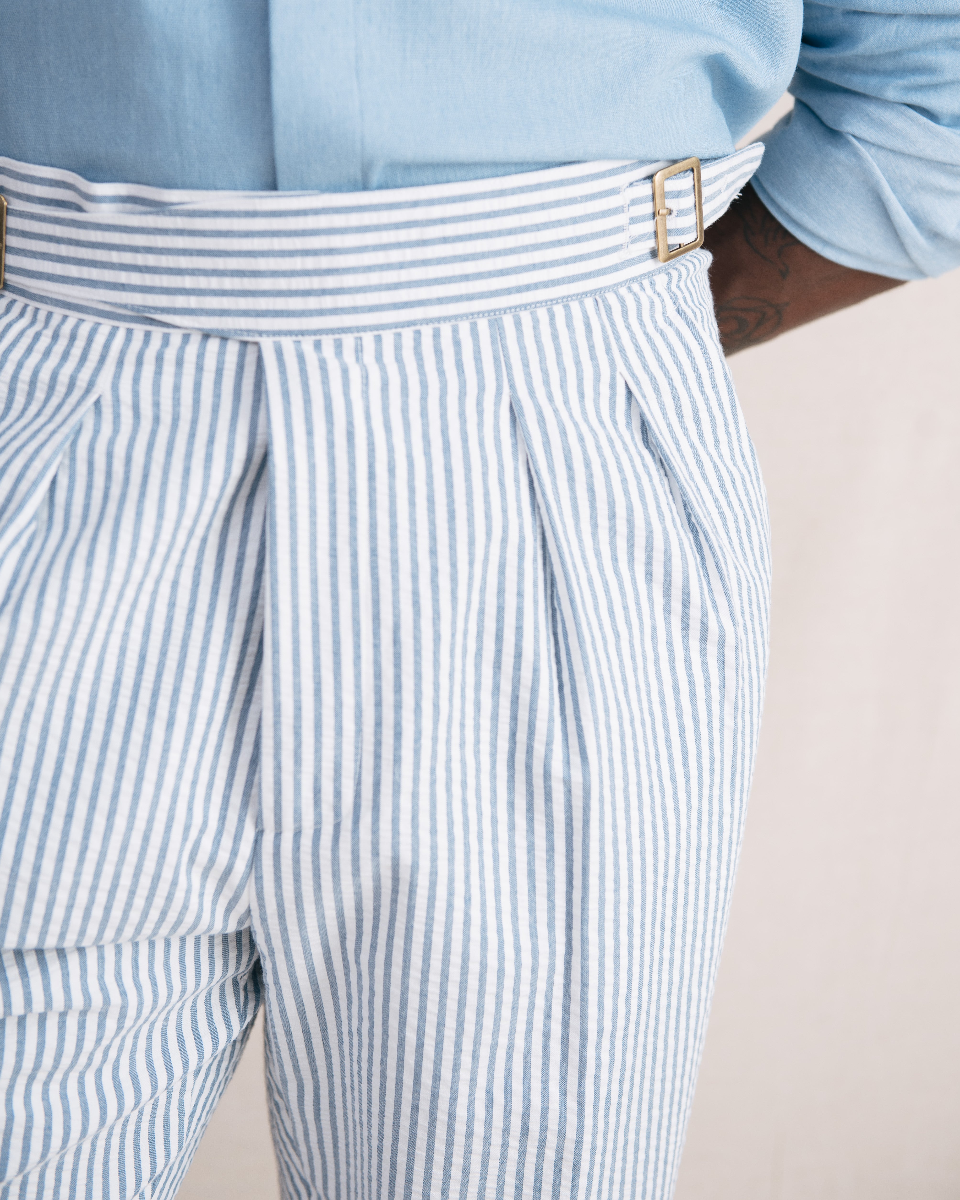 Our Seville Seersucker Gurkha Pants are an essential for any fashion forward mans wardrobe. Made from a striped cotton seersucker cloth these pants give you the best of both worlds of street style & sartorial. Can be dressed up with a well tailored blazer & shirt or dressed down with a t-shirt, perfect for warmer temperatures.
