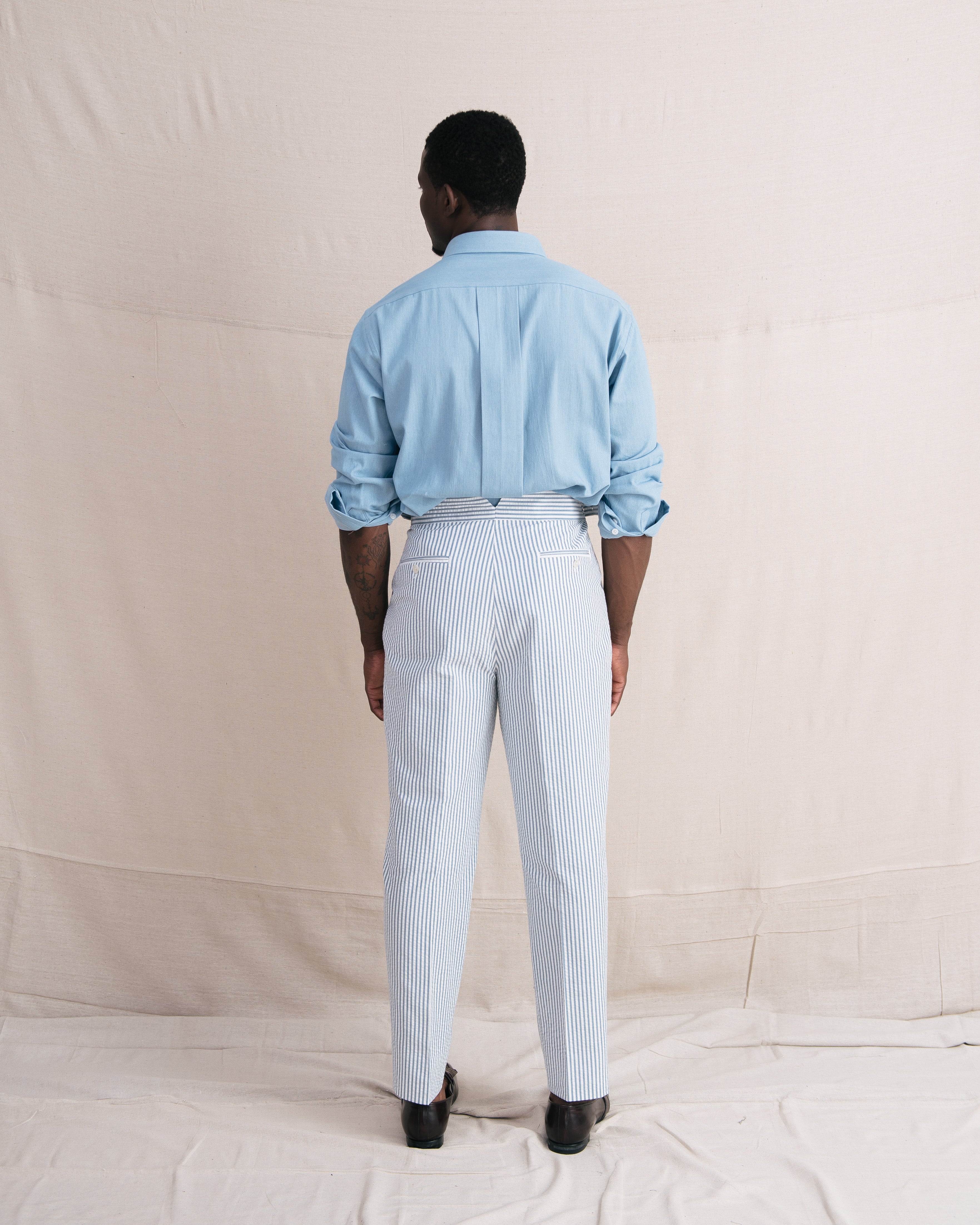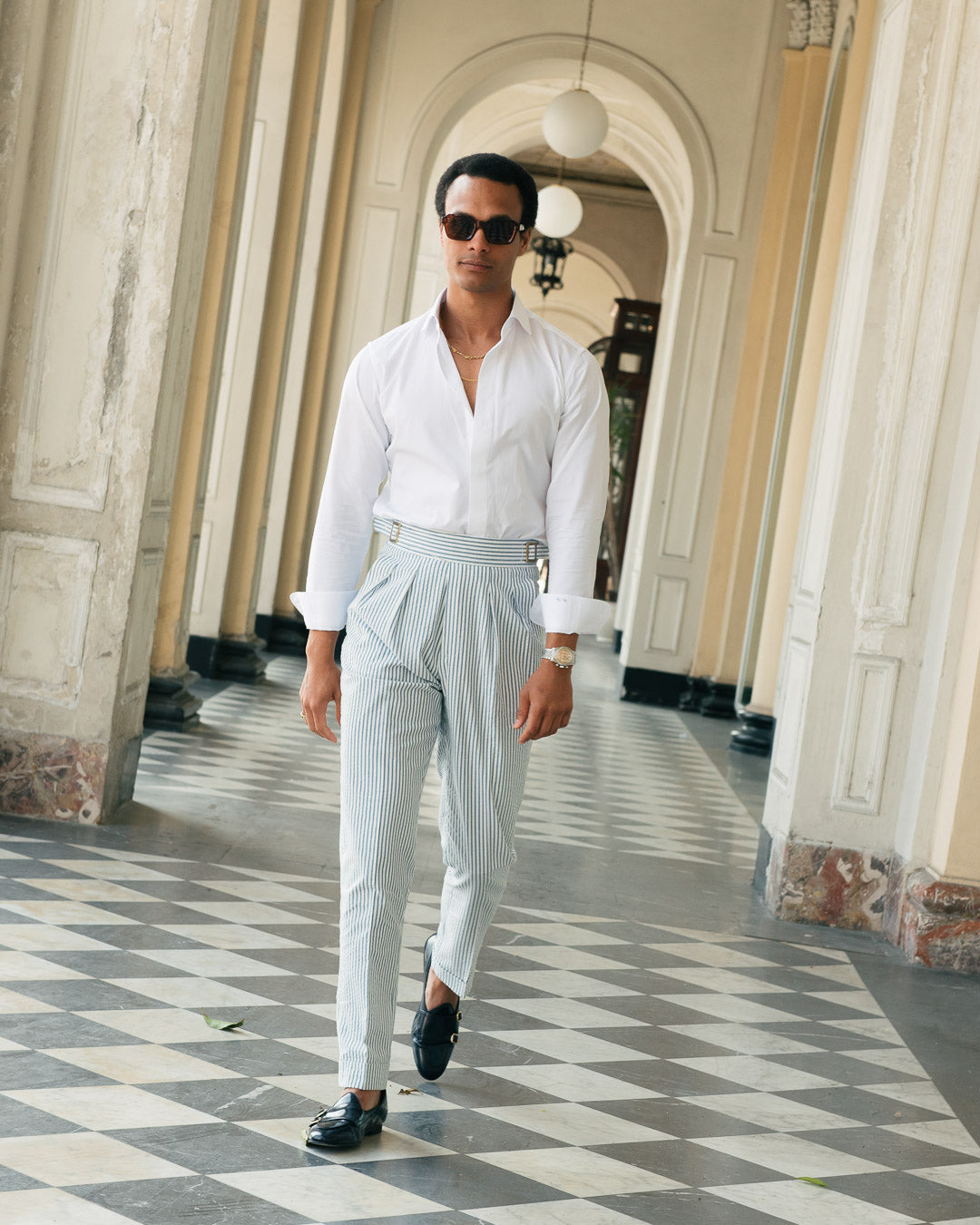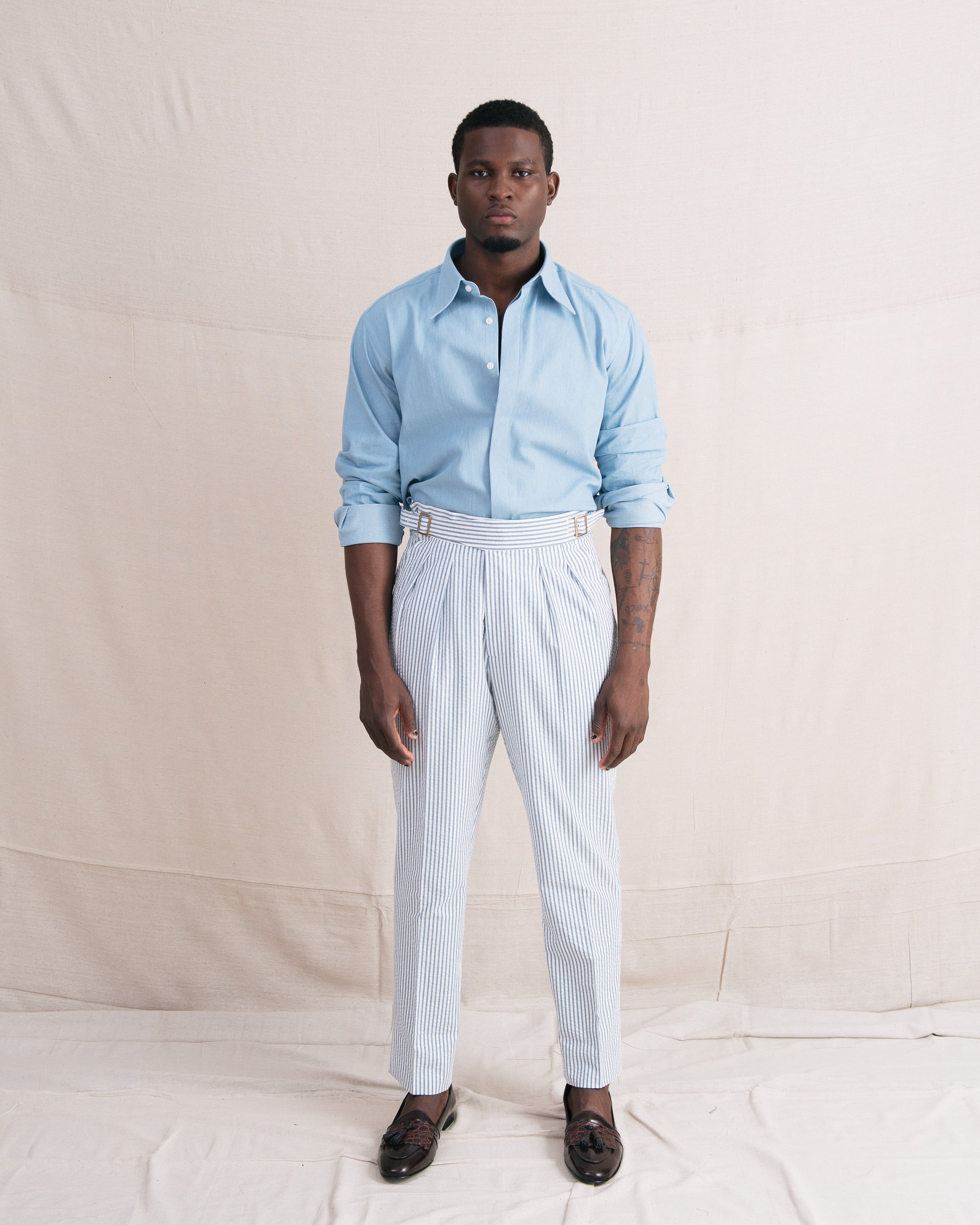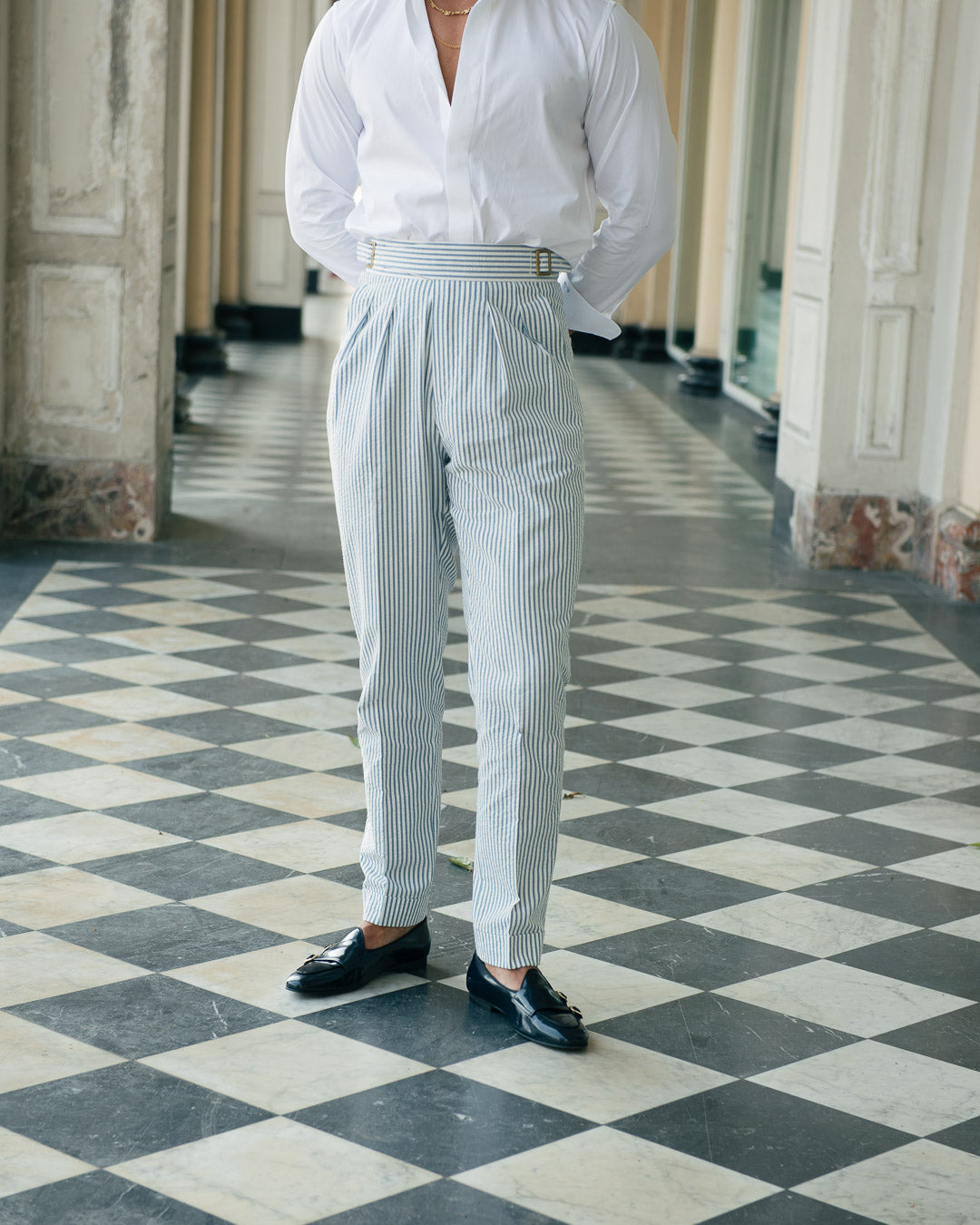 Our Seville Seersucker Gurkha Pants are an essential for any fashion forward mans wardrobe. Made from a striped cotton seersucker cloth these pants give you the best of both worlds of street style & sartorial. Can be dressed up with a well tailored blazer & shirt or dressed down with a t-shirt, perfect for warmer temperatures.