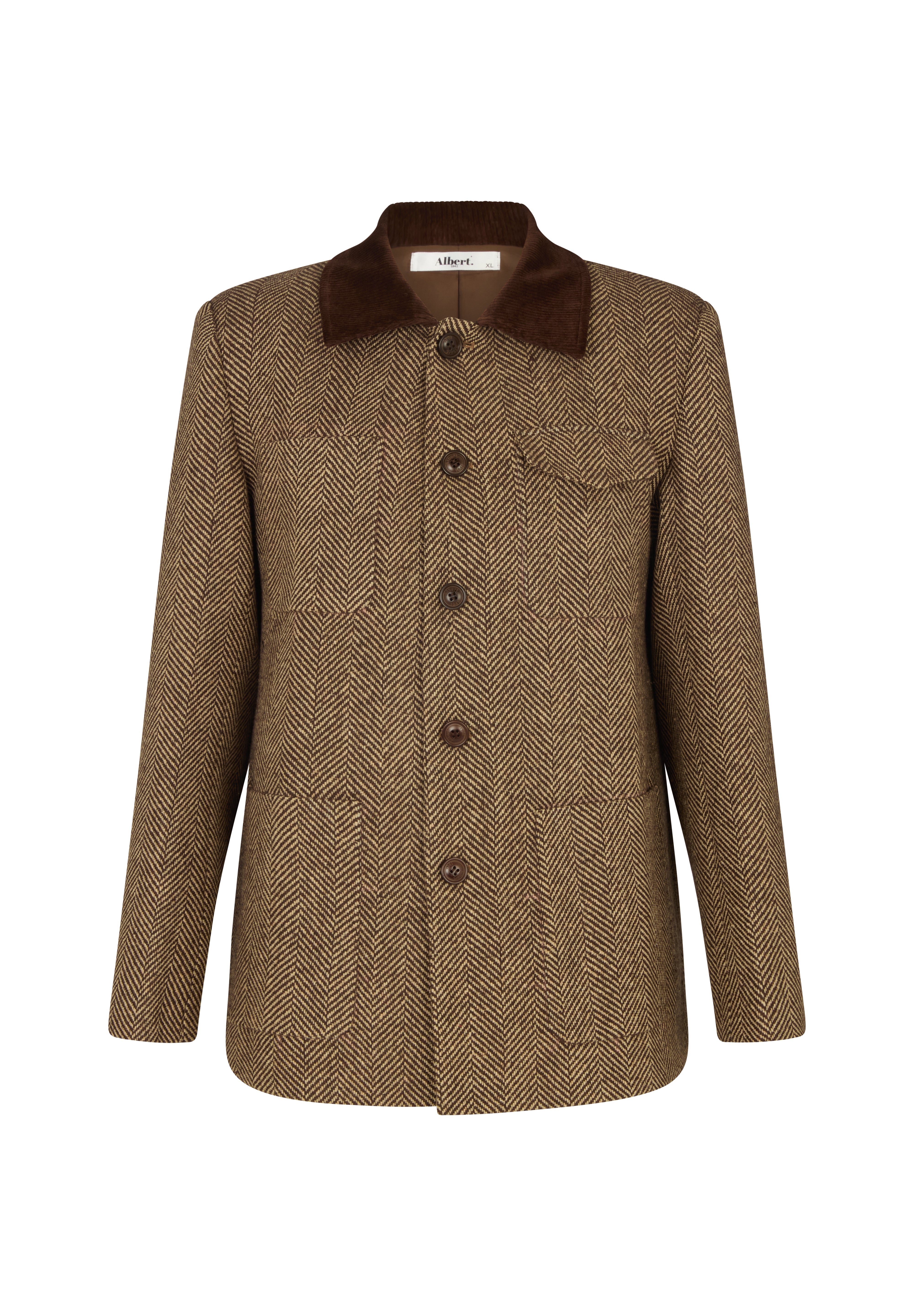 The jacket features four patch pockets that balance utility and design, while a brown corduroy collar adds a tactile contrast and a subtle nod to vintage craftsmanship. Its structured yet easy fit allows for comfortable layering, making it as practical as it is refined.