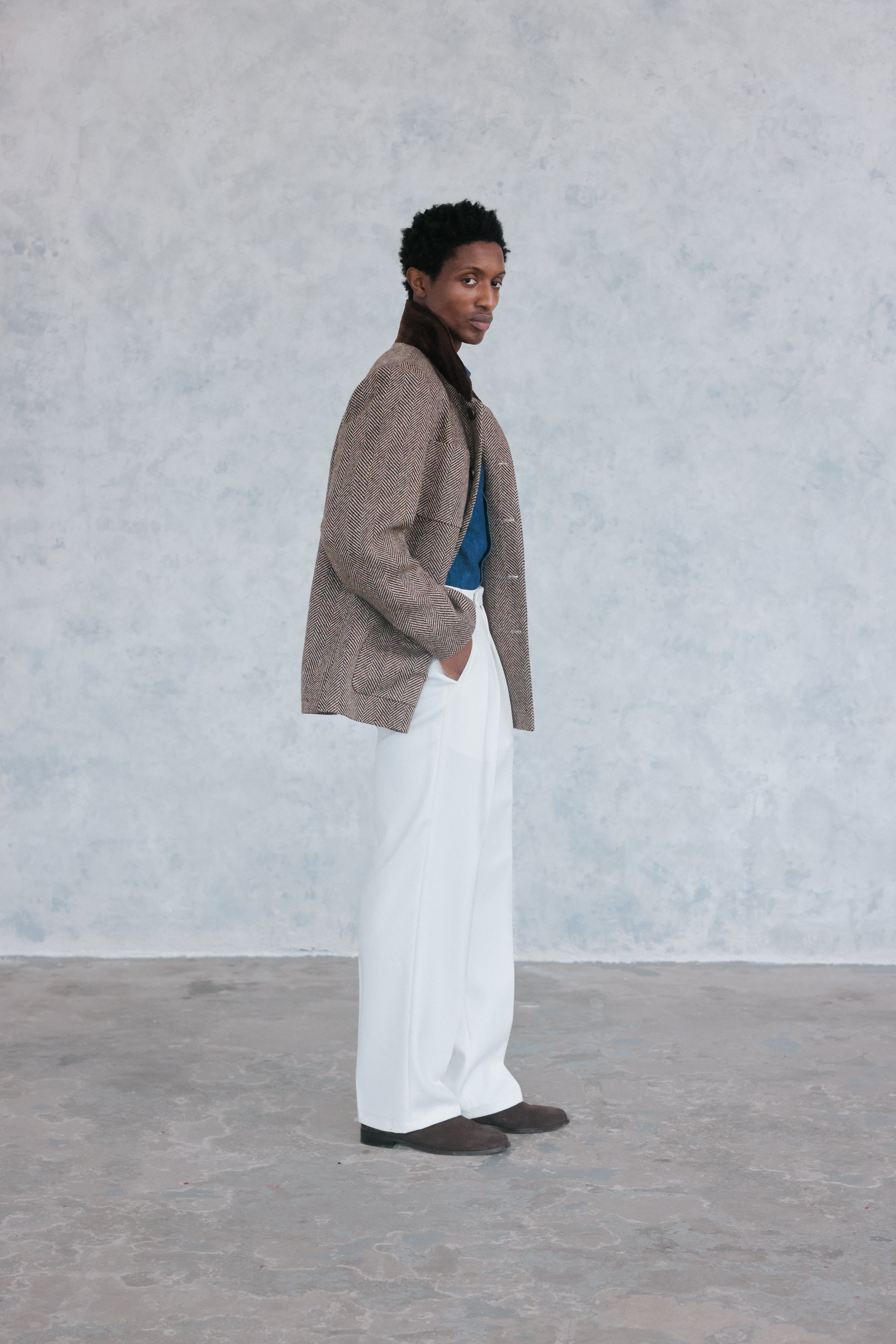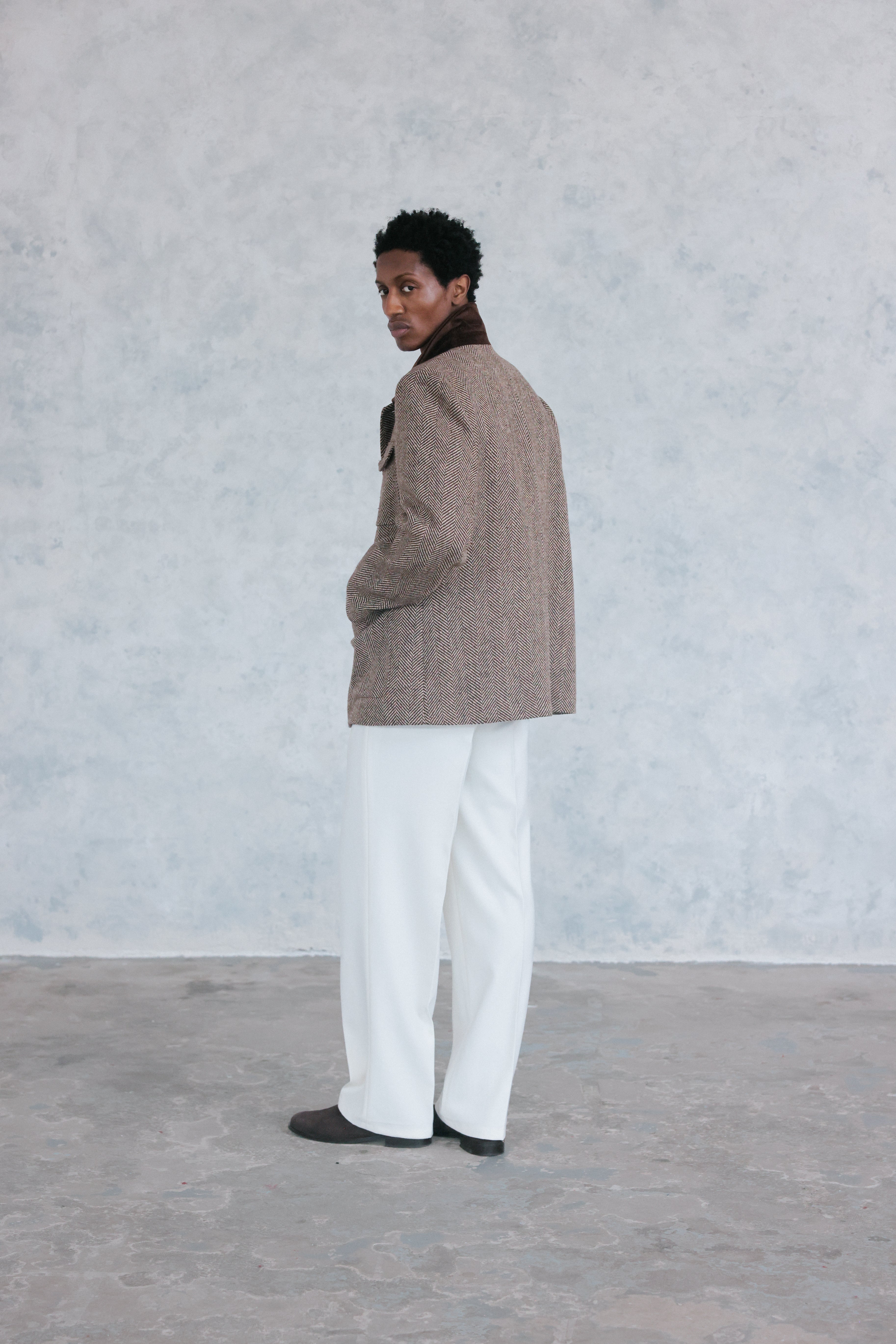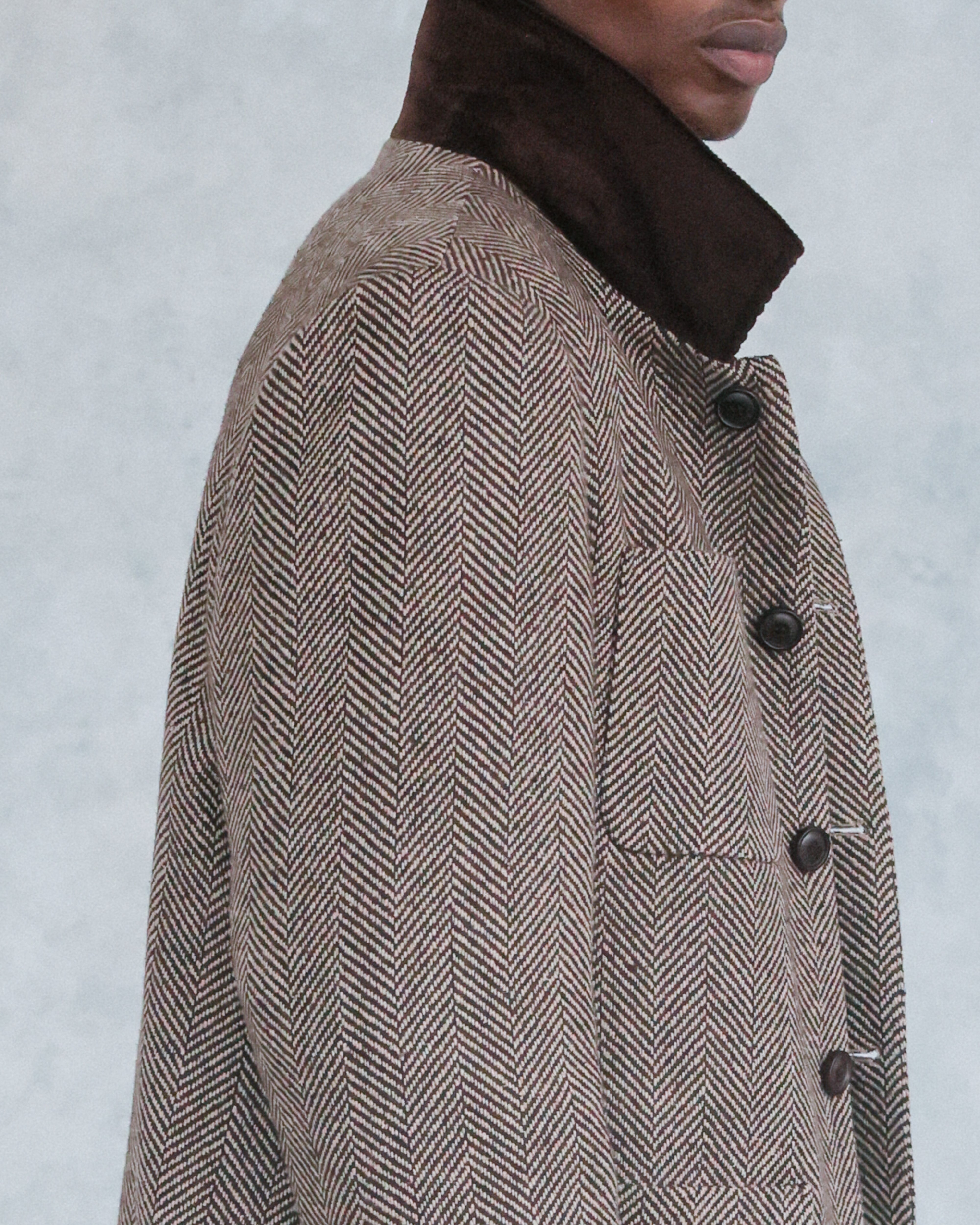 Rooted in workwear heritage and refined through contemporary tailoring, The Stanley Chore Jacket captures the essence of functional elegance. Crafted from a rich brown herringbone wool, it combines texture, warmth, and depth, giving a sophisticated update to a timeless silhouette.