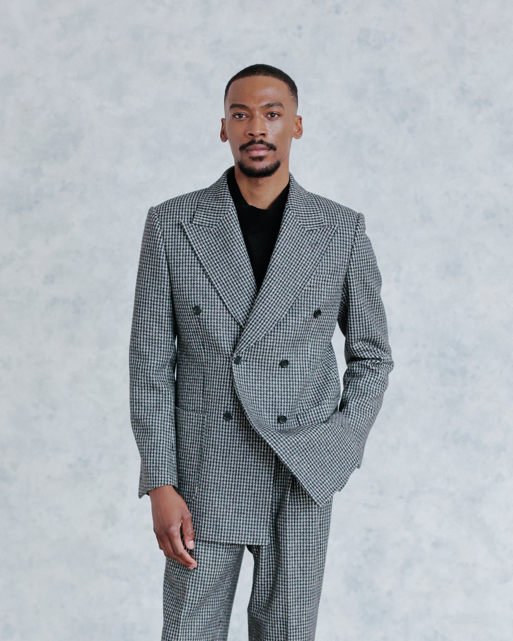 The Walton Blazer brings a fresh perspective to classic menswear, rendered in a refined grey houndstooth wool that balances tradition with modern sophistication. The subtle interplay of tones lends depth and texture to the cloth, creating a versatile pattern that feels both timeless and distinctly contemporary.